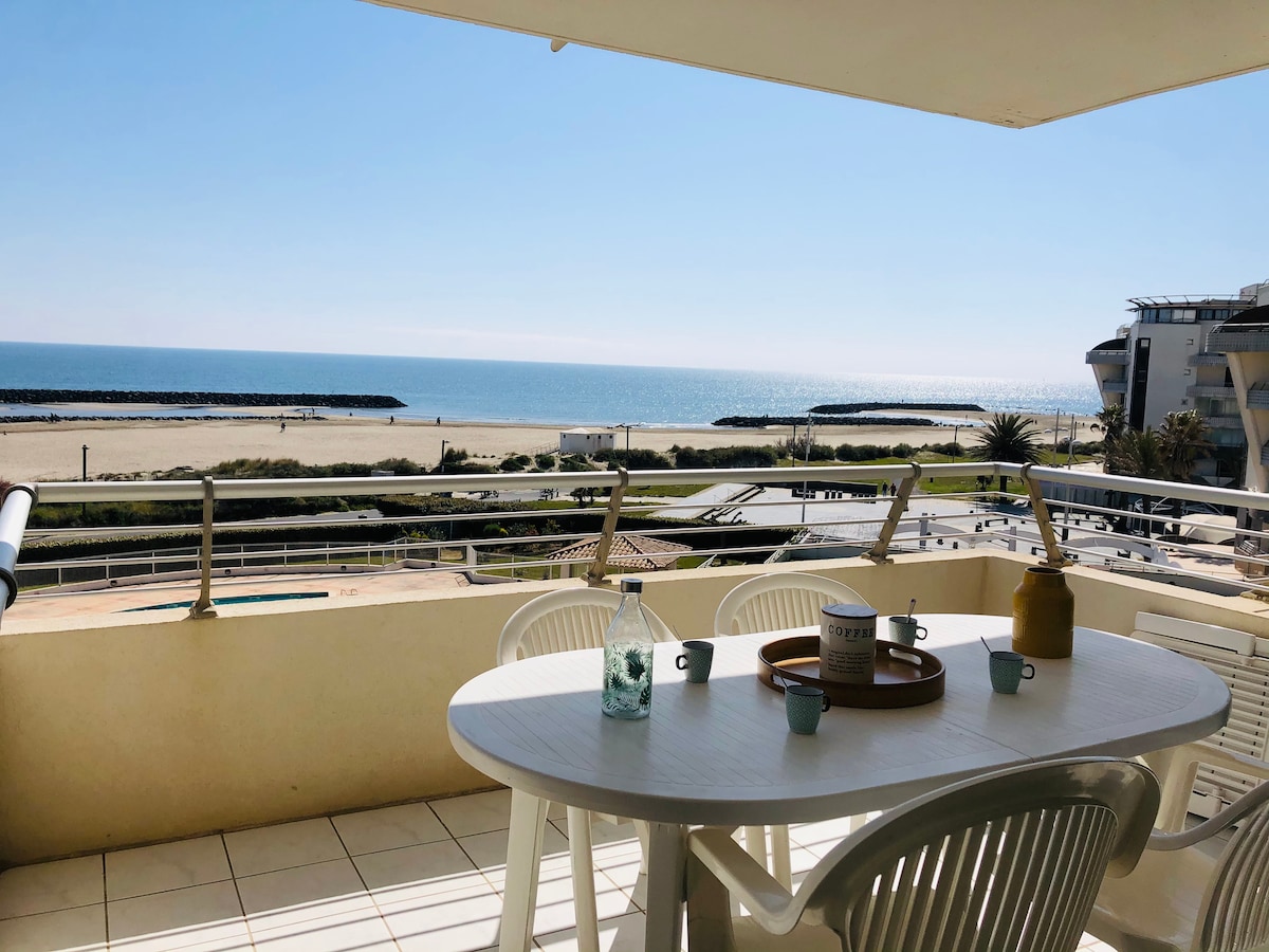 Slepptu farangrinum og slakaðu á í íbúðinni Alexandre með fjölskyldu þinni eða vinum Þessi þriggja manna íbúð við sjávarsíðuna er staðsett á einkasvæði Cap d'Agde og býður upp á beinan aðgang að bestu ströndum (1mn göngufjarlægð) meðfram öllum nescessary vörum (matvöruverslun, verslunum, veitingastöðum, börum..) sem þarf til að tryggja þér ógleymanlega dvöl Allt er í göngufæri Stór verönd Einstakt draumur sjávarútsýni Rólegt svæði Einkabílastæði HREINSAÐ FULLKOMLEGA FYRIR HVERJA KOMU