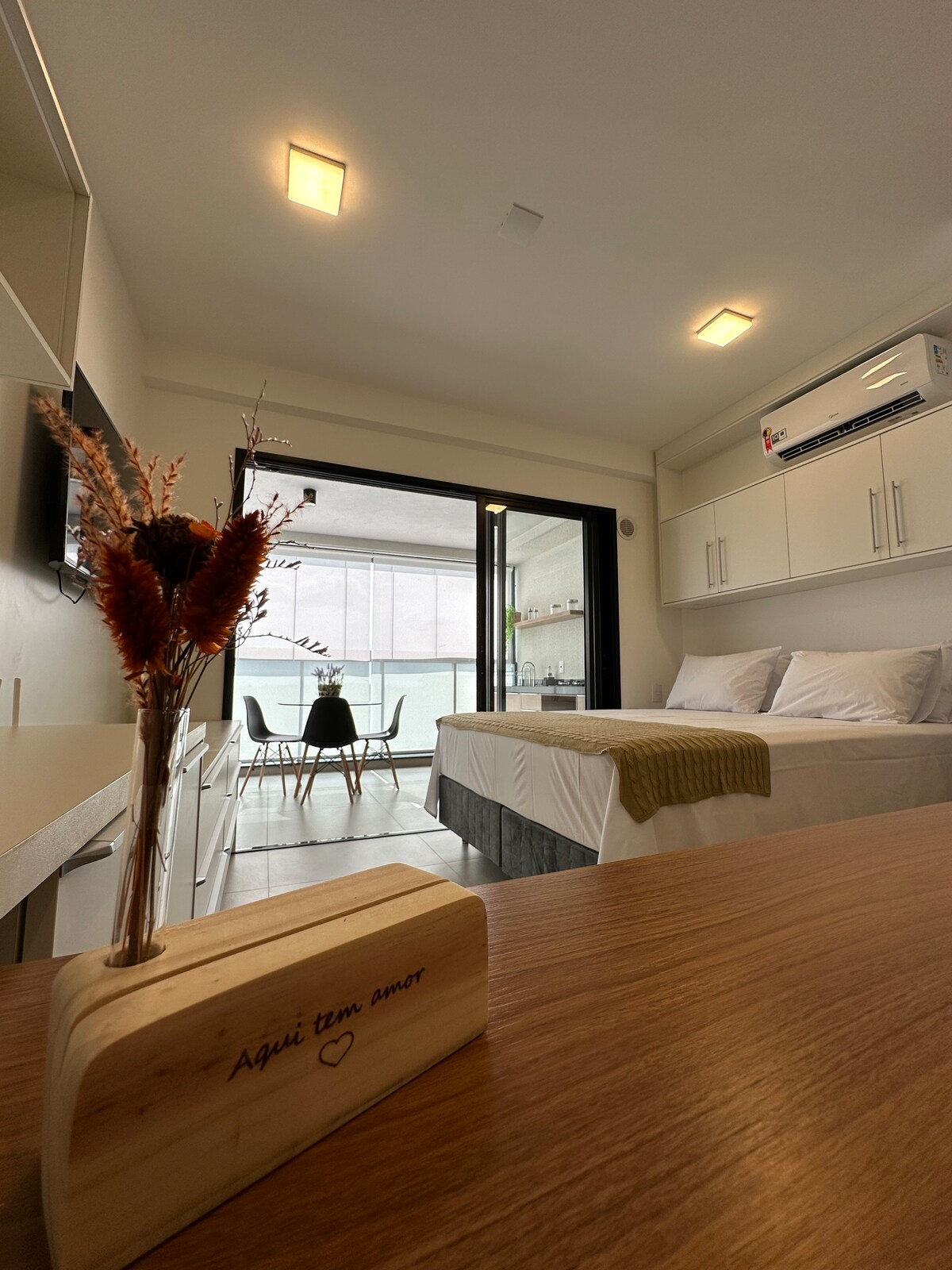 Studio 811 er nýtt, skipulagt, þægilegt og vel staðsett rými. Á stefnumarkandi stað nálægt Avenida Esmeralda. Nágranni Esmeralda verslunarmiðstöðvarinnar með mathöll, kvikmyndahúsum og verslunum). Staðsett fyrir framan tvo aðalmarkaði í Marília: Tauste og Trust. Einnig nálægt læknadeildinni, Bus Station, SP 294 og BR 153. Fyrir framan göngustíginn frá Av. Esmeralda, auk tveggja Smart Fit Gyms í 100 metra fjarlægð. Húsið þitt í kexlandinu!