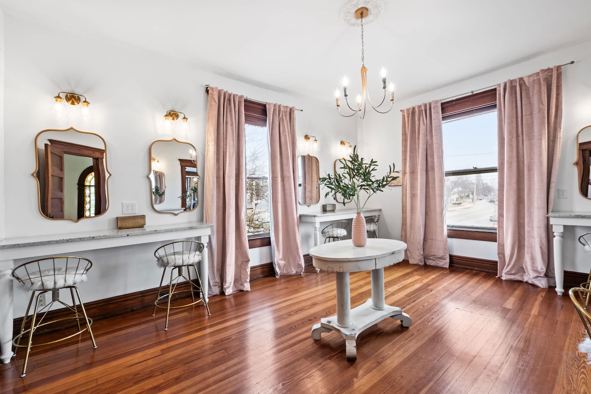 This unique historic mansion in heart of New Albany, is just a short walk to the nightlife and restaurants in downtown New Albany and less than ten minutes to downtown Louisville. Thoughtfully renovated to maintain the character of this classic home and to give the comfort of modern amenities. It was designed to entertain with the many areas to congregate and make lasting memories. Karaoke in the living room, several photo op walls, glam room, enjoy the hot tub, or chill in the pink bar room.
