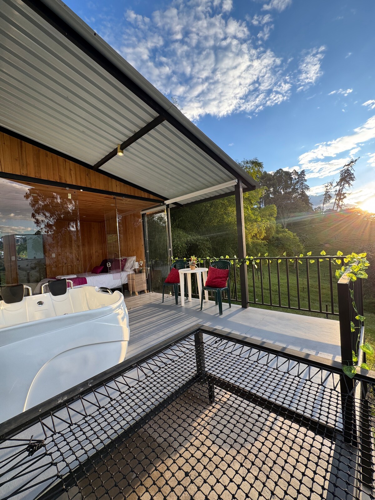 Un espacio tranquilo rodeado de naturaleza, aves y paisajes para pequeñas familias o tu pareja , ven y disfruta de amaneceres increíbles y atardeceres únicos relajados desde el Jacuzzi. En la habitación principal cuenta con comedor y cafetera y adicional tiene un altillo super agradable, para compartir y también con sofacama para los niños. Delicioso desayuno a la carta incluido.