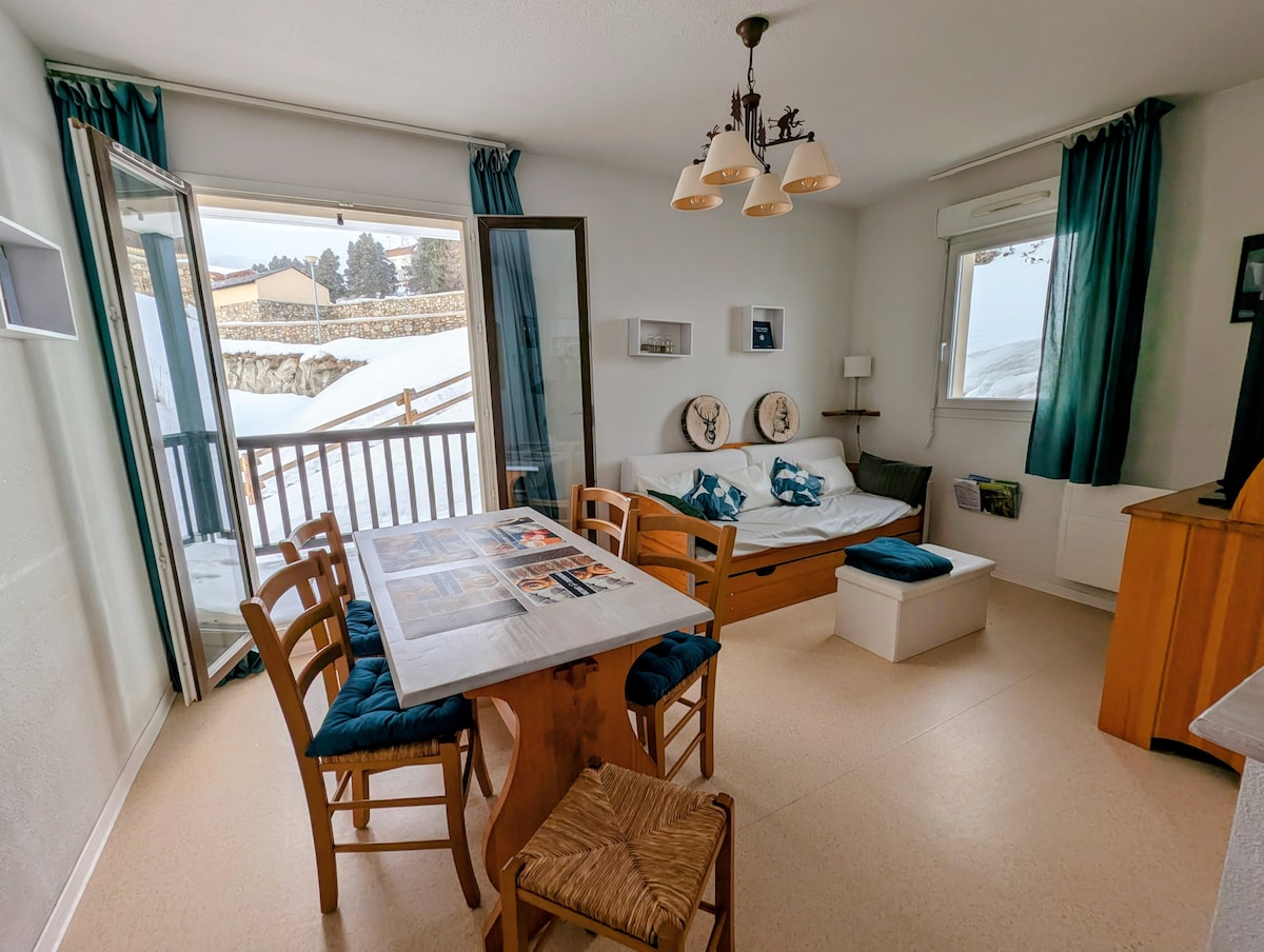 Stúdíó íbúð staðsett í Odalys Mille Soleils íbúðarhúsinu í Font-Romeu. Íbúðin er í 500 metra fjarlægð frá miðbænum og þaðan er bein skutluþjónusta að skíðabrekkunum. ☀️Verönd☀️ Allt sem þú þarft fyrir dvöl þína er innifalið í verðinu: sturtugel, hárþvottalögur, hárþurrka, raclette og fondúvél! Lök og handklæði eru ekki innifalin (hægt er að fá þau innifalin gegn 10 evrum í viðbót fyrir hvert rúm og óska eftir þeim við bókun). INNIHALDUR Í FEBRÚARFRÍ