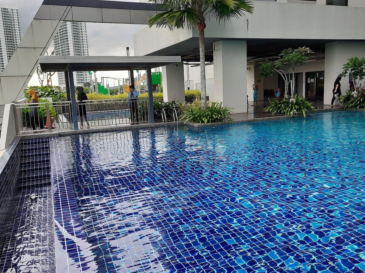Gistu hátt yfir Sunway City Iskandar á 18. hæð í lúxusheimilinu Sunway Grid Residence. Þessi stílhreina, nútímalega einkaeign er sjaldgæf gersemi með framúrskarandi þægindum eins og aðgangi að ýmsum sundlaugum, líkamsræktarstöðvum og afdrepum í kringum eignina. Íbúðin býður upp á yfirgripsmikið útsýni, nútímalegt eldhús og þrjú þægileg svefnherbergi. 5 mín ganga að X Park 10 mín ganga að Sunway Big Box Retail Park 8 mínútna akstur til Legolands 10 mín akstur til Puteri Harbour Upplifðu Sunway City með okkur og lærðu meira hér að neðan!