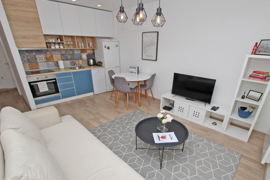 A cosy apartment offers everything you need for a pleasant stay. We have thought through every aspect of our guests' confort, so we provided large and confortable bed, cozy sitting area with cable TV and WiFi, fully equipped kitchen and bathroom. Udoban i moderan apartman može da ugosti do 4 osobe i sastoji se od spavaće sobe sa velikim i udobnim krevetom, dnevnog boravka sa ležajem na razvlačenje, potpuno opremljene kuhinje, trpezarije i kupatila. Apartman posjeduje kablovsku TV, klimu i WiFi.
