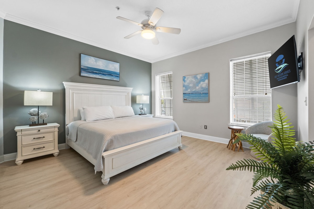 Upplifðu flóann í nýuppgerðri íbúð! Þessi fjölskylduvæna eining á jarðhæð býður upp á þægindi. Hjónaherbergið er með sjávarútsýni, king-rúm með útdraganlegu trissu. Annað svefnherbergið er með king-rúmi með ruslafötu og það þriðja er með queen-rúmi. Stofan er með queen-svefnsófa. Hvert svefnherbergi er með sérbaðherbergi og sjónvarpi. Njóttu ókeypis strandþjónustu frá mars til okt með tveimur stólum og sólhlíf. Stígðu út á sandinn, slakaðu á og slappaðu af! Aðeins gestir 27+. Reykingar bannaðar. Ekkert veisluhald