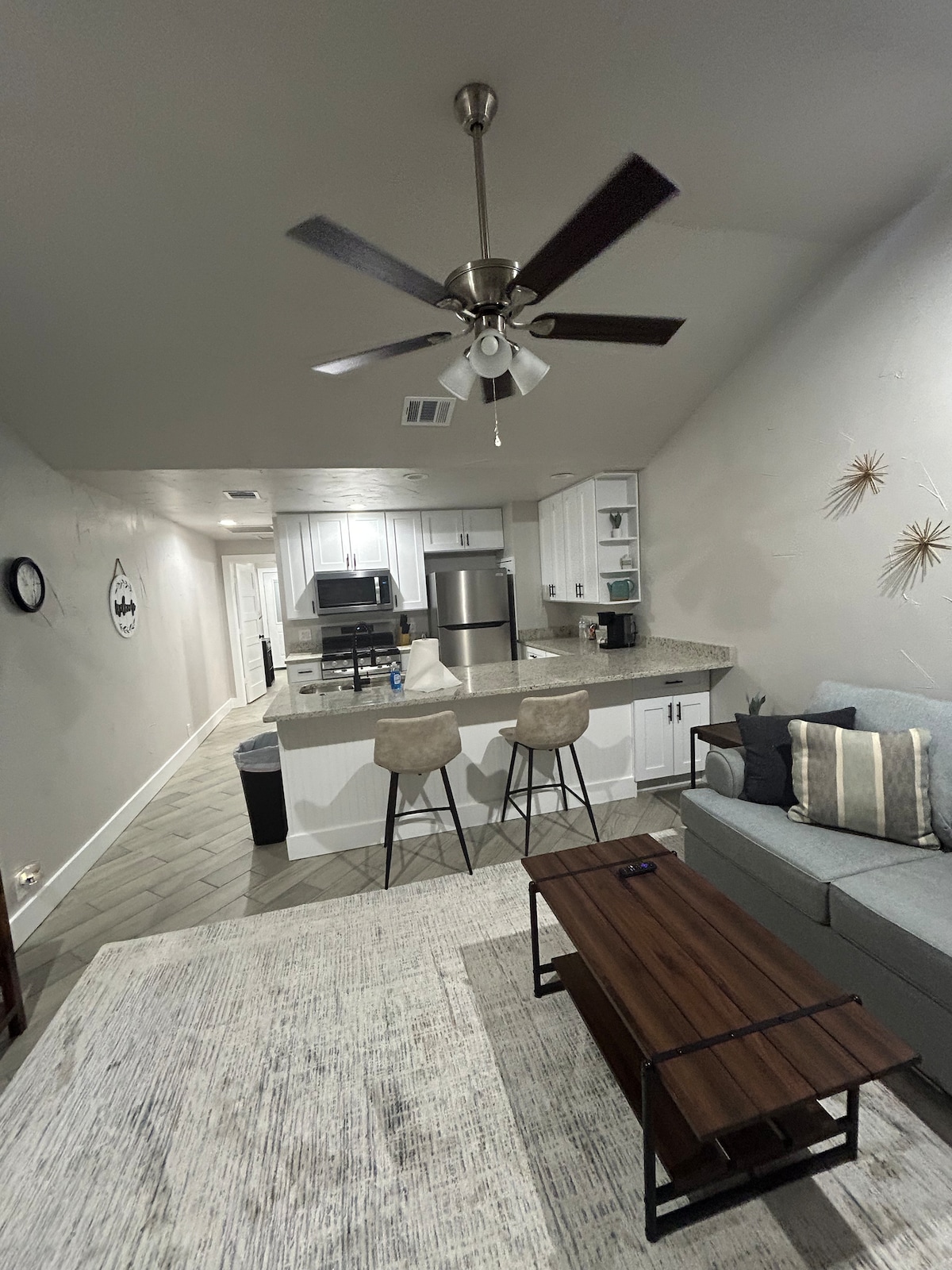 Come and enjoy your time at this centrally located one-of-a-kind place! Newly remodeled, one bedroom, one bathroom property within a 2-minute drive to the famous FW Stockyards! Guests will have a comfortable living area to unwind and relax after a long day exploring Fort Worth. This fully stocked kitchen has granite countertops and everything you need to prepare a meal if guests desire to. All appliances are full-sized in the property. There are 2 Roku tv's, along with high-speed internet.