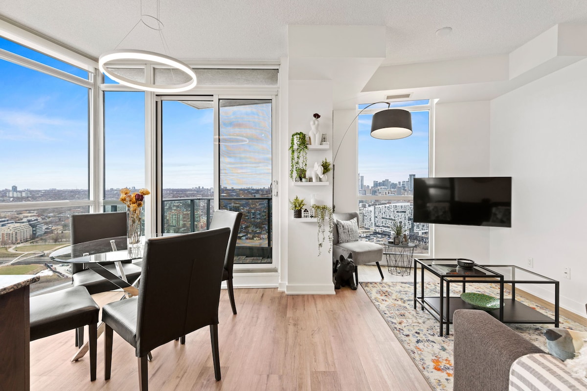 Ef magnað útsýni yfir Ontario-vatn og Toronto Sunset er eitthvað fyrir þig þarftu ekki að leita lengra! Nýlega uppgerð 2ja svefnherbergja íbúð með fullum þægindum sem henta fullkomlega fyrir skammtímagistingu eða fjarvinnu. Staðsett á Fort York Blvd, nálægt Lakeshore Blvd, Gardiner Expressway, götubílum, rútum og stuttri göngufjarlægð frá miðborgarkjarnanum, Billy Bishop-flugvellinum og CN-turninum! Hentar gestum með allt að 4 w/ Gigabit háhraða þráðlaust net, AppleTV, eldunaráhöld, þvottavél/þurrkara, ókeypis bílastæði, loftræstingu, einkasvalir o.s.frv.