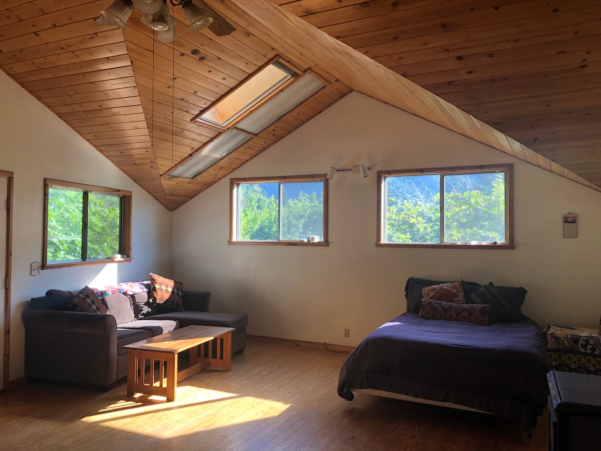 Cozy little independent studio with safe offstreet parking. Parking area and property is shared with the main house, but there is lots of privacy with a large covered porch that looks out over a veggie garden. Basic amenities provided so that you can focus on experiencing the great outdoors in the nearby state and national parks or any of the other local sightseeing opportunities. It is a very cozy space best suited for a couple or single guest. Or travel with a pet - fully fenced yard provided.