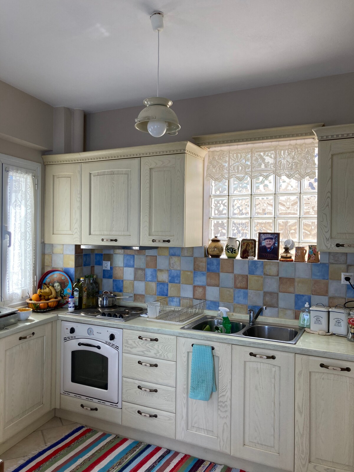 Das traditionelle Steinhaus grenzt an einer Seite an die natürliche Felswand. Das Bad ist ganz in den Fels hinein gebaut. Das ergibt ein ganz spektakuläres Wohngefühl und den Eindruck, mitten in der Natur zu sein. Die Terrasse hat eine wunderschöne Aussicht auf das Meer, den Strand von Fytema und die Berge von Messaria. Die Wohnung ist 2023 mit ökologischen Materialien im traditionellen Stil ausgebaut worden. Zum Strand sind es nur 200 m.