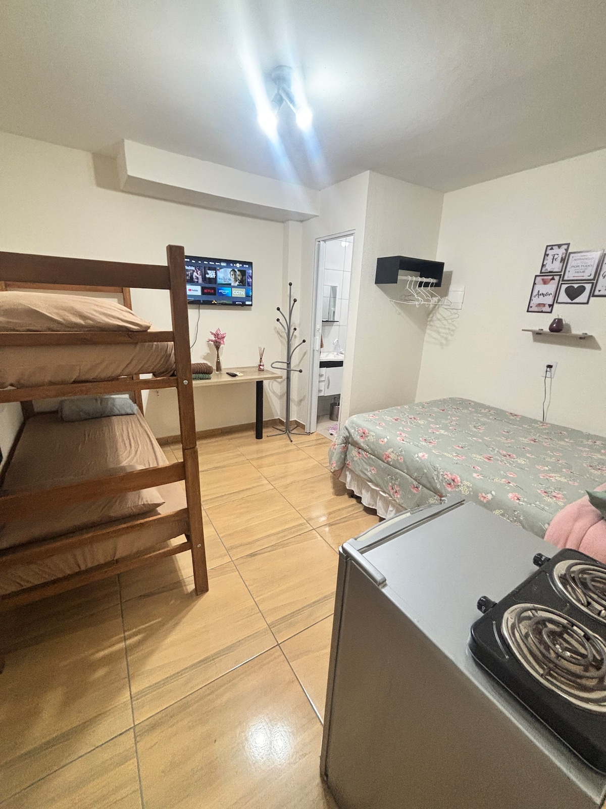 Suíte aconchegante, possui 1 bicama ou (2 camas de solteiro), e 1 cama de casal com colchão queem size ,tv de led com wifi, localizado bem próximo do centro mas com muito silêncio durante a noite para que sua noite seja tranquila e seu sono seja renovador para que vc possa estar descansado para conhecer as belezas da nossa cidade