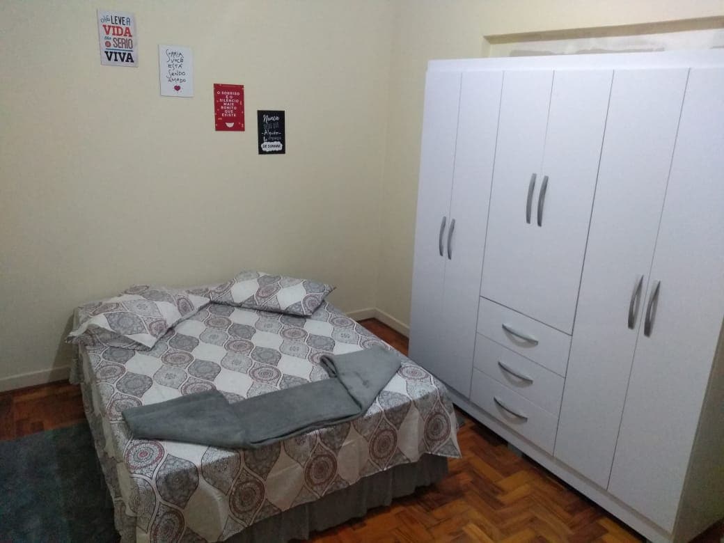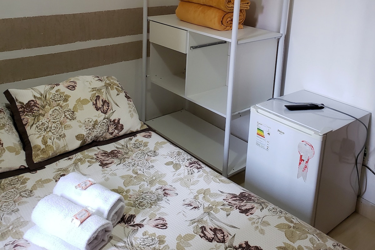 Quarto com banheiro privativo. Quarto individual com banheiro privativo. O quarto com banheiro privativo está equipado com microondas, frigobar, mesa de jantar, pratos, talheres e copos. Inclui TV Smart 43, ferro de passar roupa, secador de cabelo e enxoval de cama e banho.