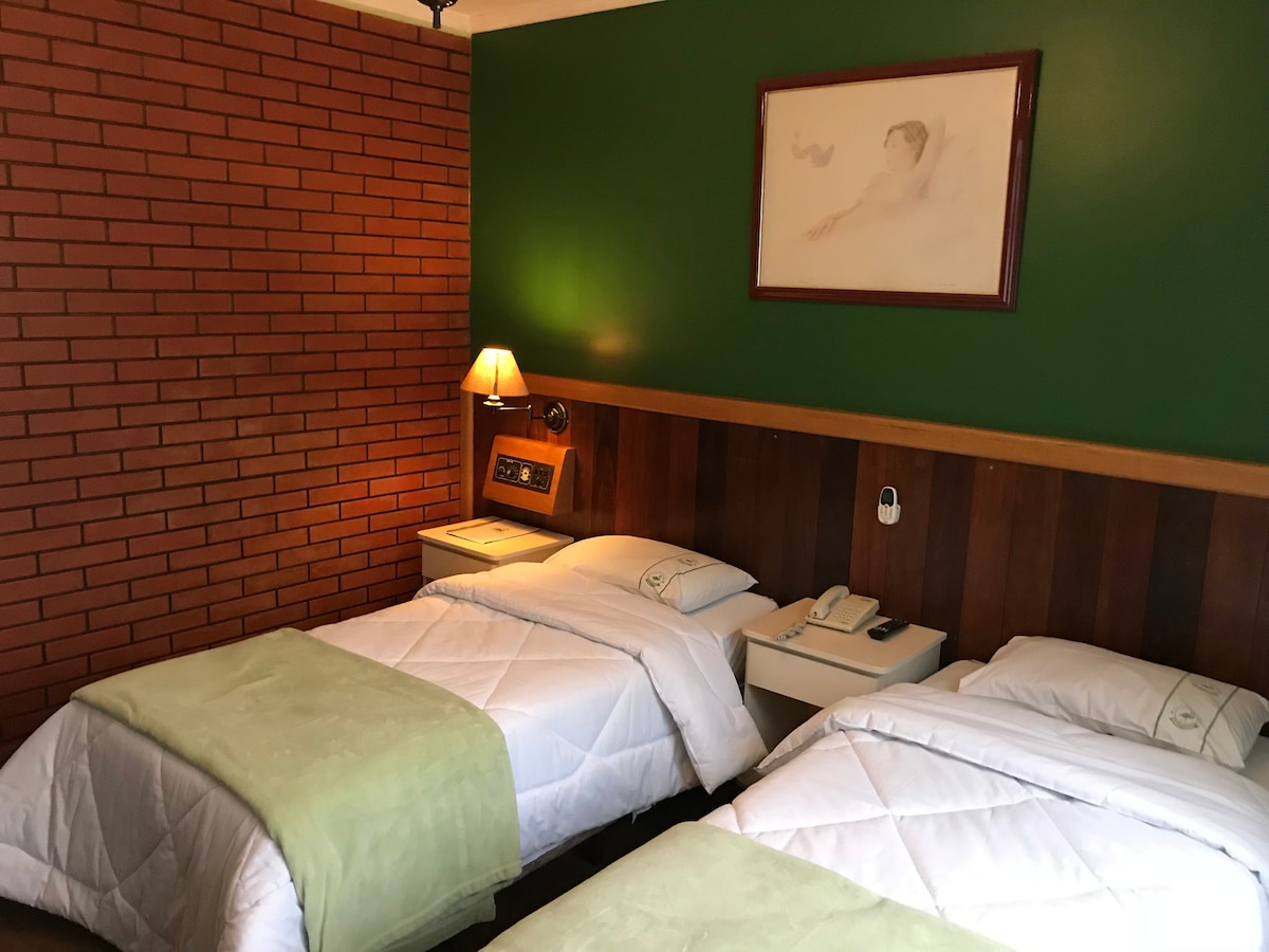 Quarto duplo com 2 camas de solteiro medindo 1,89m por 90cm. Sala equipada com TV a cabo.