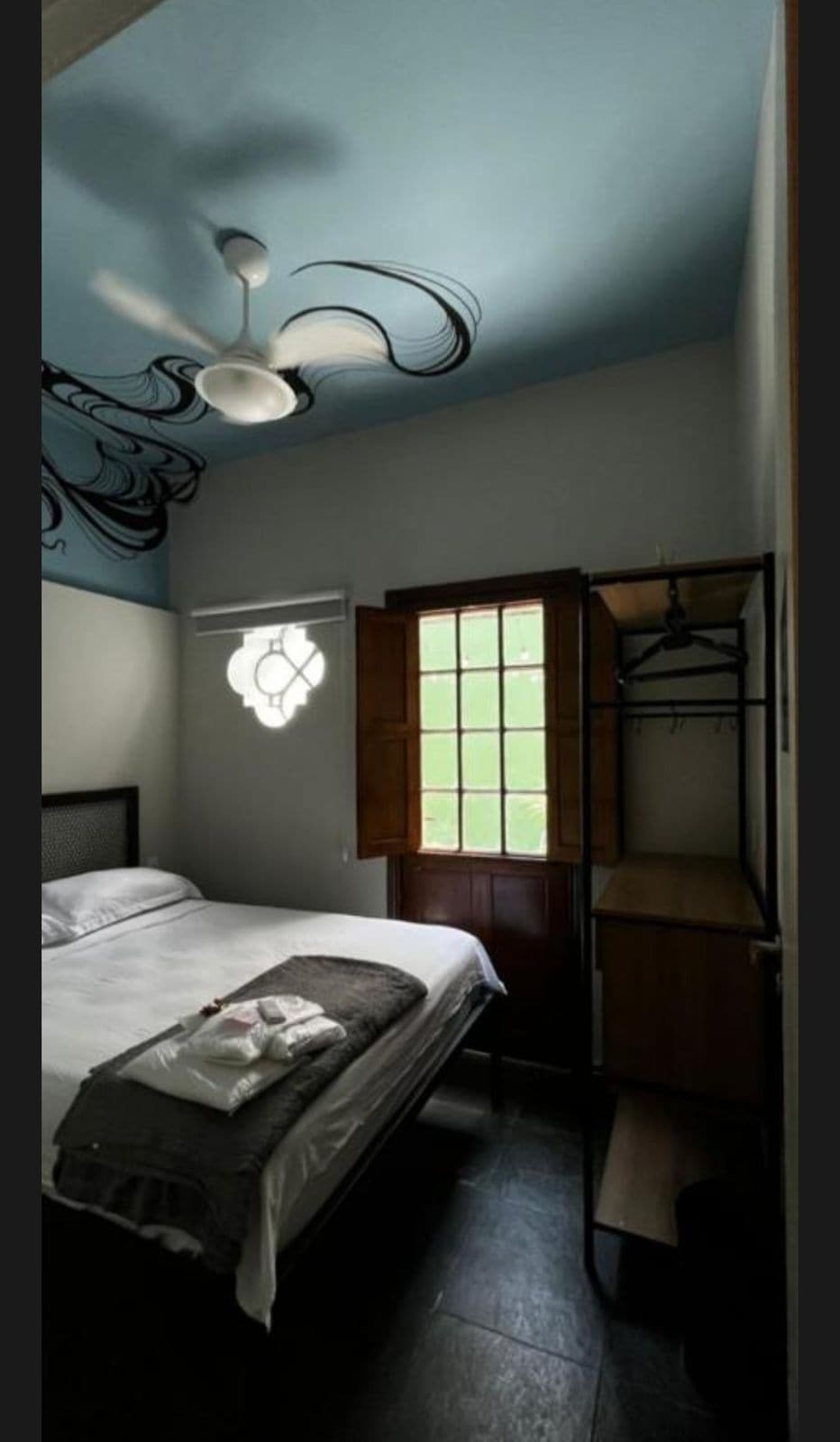 Besti kosturinn er sérherbergi nágrannans fyrir þá sem kjósa að hafa sitt eigið horn og geta enn kynnst nýju fólki og skipst á upplifunum. Hér er pláss til að taka á móti hlutum (fatahengi, hillum og skotti) og það er fullkomið fyrir þá sem koma einnig sem par. Hér eru hliðarborð við rúmið, vinnuborð og vifta. Það er vel loftræst, með tveimur gluggum: einn fyrir innri verönd hússins og einn fyrir götuna. Aðgangur að eigninni er með tröppum.