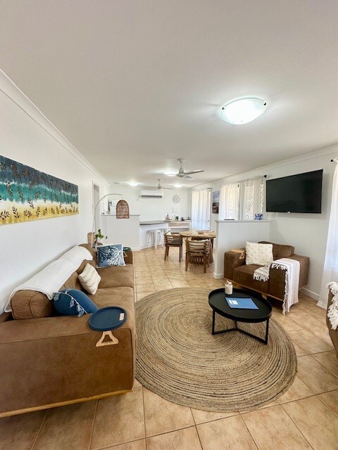 With beautiful ocean views and being located a short walk from IGA, restaurants, the beach, each self contained villa consists of 2 bedrooms 1 bathroom, kitchen, washing machine, NEW air conditioner, shower, toilet and tv. The main bedroom has a Queen bed. The second bedroom has one double bed & two single beds, sleeping 6 people comfortably. patio has a bbq and table With three villas on one block the villas are perfect for group getaways. There is plenty of parking space for cars and boats.