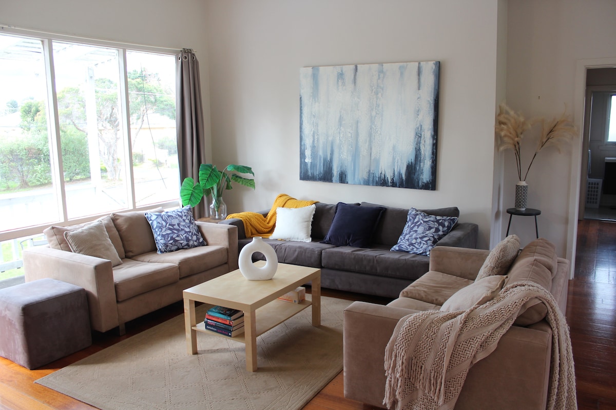Endurnýjuð villa með öllu sem þú þarft. Rúmgóðar vistarverur, snjallsjónvarp og DVD-diskur, Bluetooth-hátalari, felur einnig í sér námskrók. Njóttu eldamennskunnar í frábæra eldhúsinu, nægu plássi fyrir bekkinn, ketilinn, brauðristina o.s.frv. Slakaðu á í nuddbaðinu eða njóttu regnsturtunnar. Þægilegt king size rúm með sjónvarpi í hjónaherbergi, það er einnig annað svefnherbergi með kojum. Rólegt og friðsælt svæði með sólríkum húsagarði. Nálægt almenningsgörðum og krám, nálægt víngerðum og heitum lindum á Mornington-skaga. (Ekki er aðgangur að þráðlausu neti eða þvottahúsi)