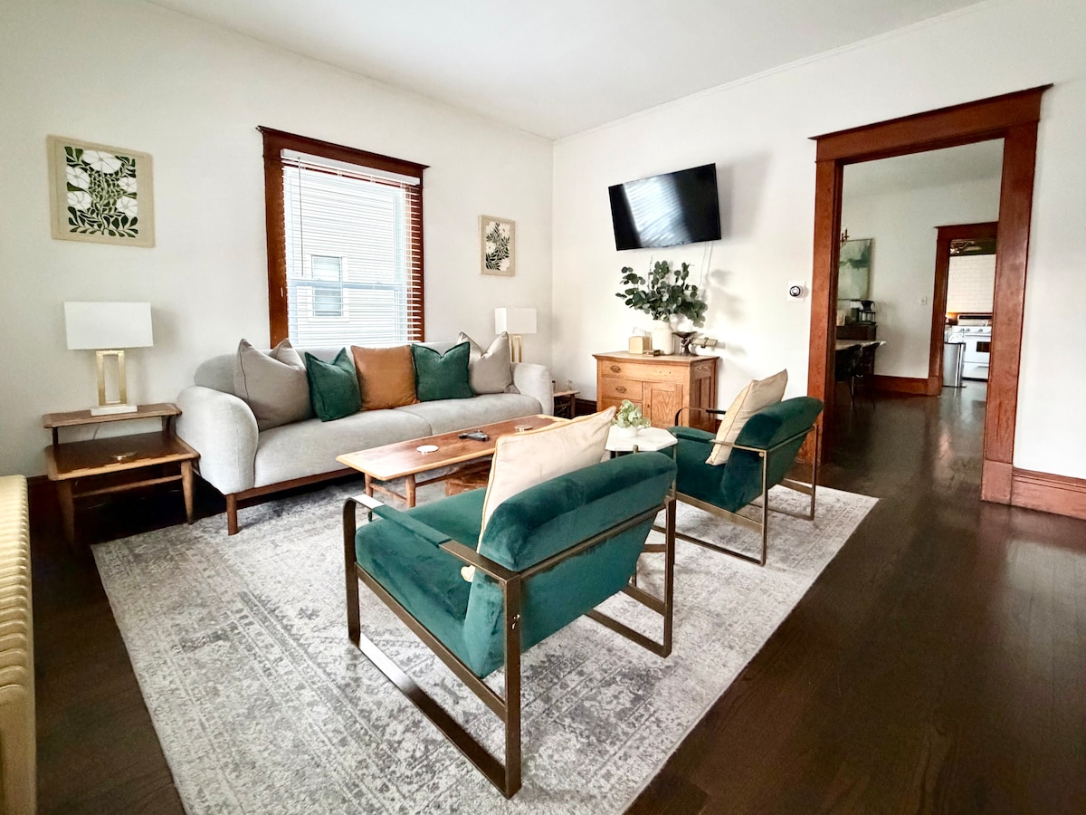 Íbúð 1 er neðri íbúðin í heillandi tveggja íbúða heimili með sögulegum svip sem býður upp á notalega gistingu. Njóttu upprunalegra harðviðargólfa, fallegra viðarvinnslu og innbyggðra skápanna í borðstofunni og eldhúsinu. Stórt borðstofuborð er fullkomið fyrir máltíðir eða vinnu. Slakaðu á með geislum frá hitagjafa, myrkingu, góðu plássi í skápum og rúmfötum með 680 þráðum. Fyrsta svefnherbergið er með upprunalegri skúffuhurð. Hver eining er með sinn eigin inngang. Vinsamlegast athugaðu að efri einingin gæti verið í notkun meðan á dvölinni stendur.