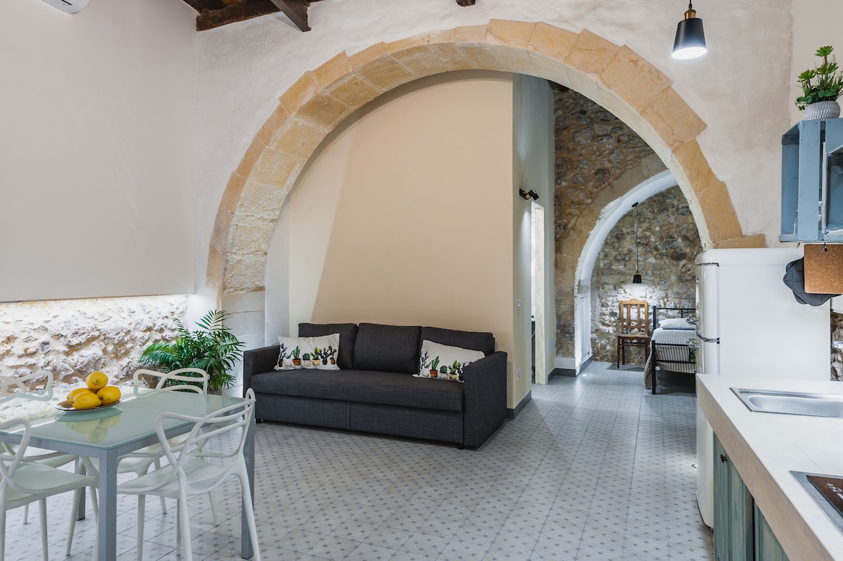 Boutique apartment, is on the first floor of a building in the Arab neighborhood of Ortigia, the historic center of Syracuse. Stiginn er brattur en stuttur. Rólegt, rómantískt og bjart. Tilvalið fyrir par. Hér eru svalir með sófaborði á Piazza fyrir notalegar og ógleymanlegar stundir. Fjársjóðskista sem heldur töfrandi stundum í fríinu. Stutt frá markaðnum og helstu áhugaverðum stöðum Ortigia.