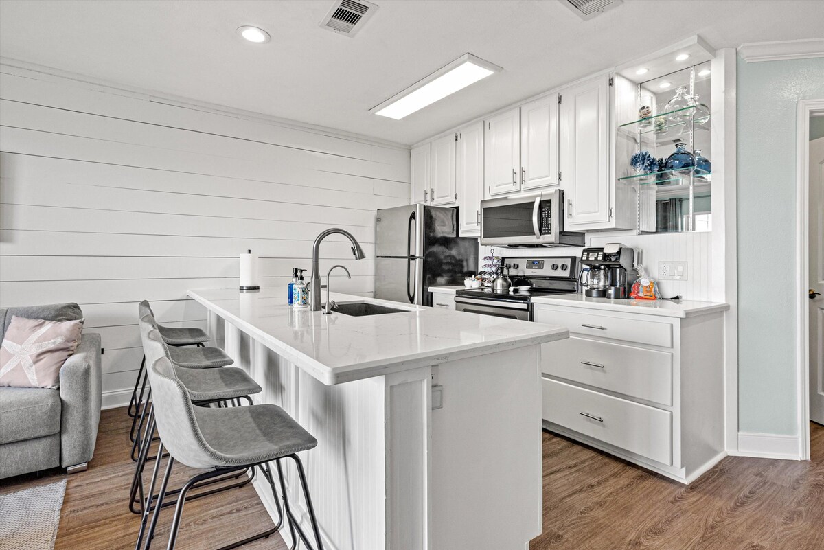 Þú munt elska hverja stund í þessari fallegu, enduruppgerðu og endurinnréttuðu íbúð sem er staðsett hinum megin við Seawall-breiðstrætið frá flóanum. Þú getur setið við borðstofuborðið og notið sjávarútsýnisins eða fært máltíðina á rúmgóða veröndina og notið hennar þar. Staðsetningin er nógu langt niður eftir breiðstrætinu til að vera ótrúlega hljóðlát en í raun aðeins augnablik frá öllum frábæru veitingastöðunum og afþreyingunni sem Galveston hefur upp á að bjóða. Fullkomið frí fyrir fjölskyldu og vini til að njóta!