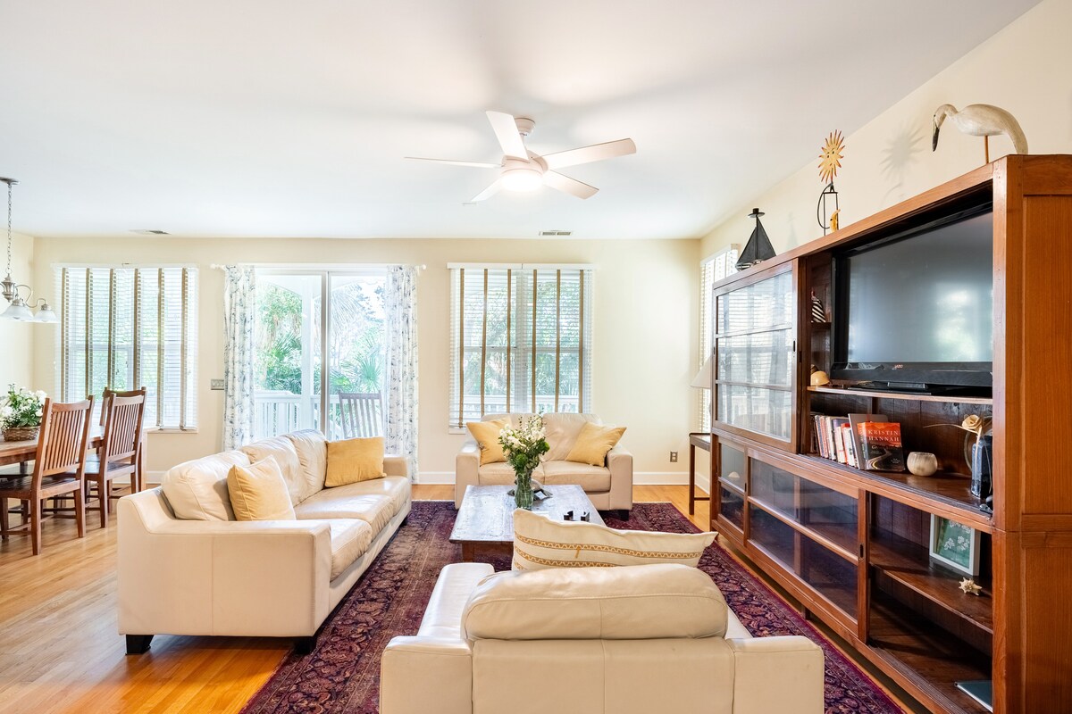 Njóttu frísins eins og enginn annar þar sem þú tekur á móti milljón dollara útsýni án þess að borga milljón dollara verðmiða! Tveggja hæða einbýlishús okkar í sveitaparadís Fripp-eyju býður upp á magnað og kyrrlátt útsýni yfir fallegt sólsetrið sem snýr í vestur og málar himininn og er stutt 3 mínútna golfvagn að mörgum aðkomustöðum við ströndina. Þetta einstaka heimili er fullkominn staður fyrir fjölskyldur til að upplifa öll frábæru ævintýrin á Fripp-eyju. Komdu því og hvíldu þig á Salt & Light!