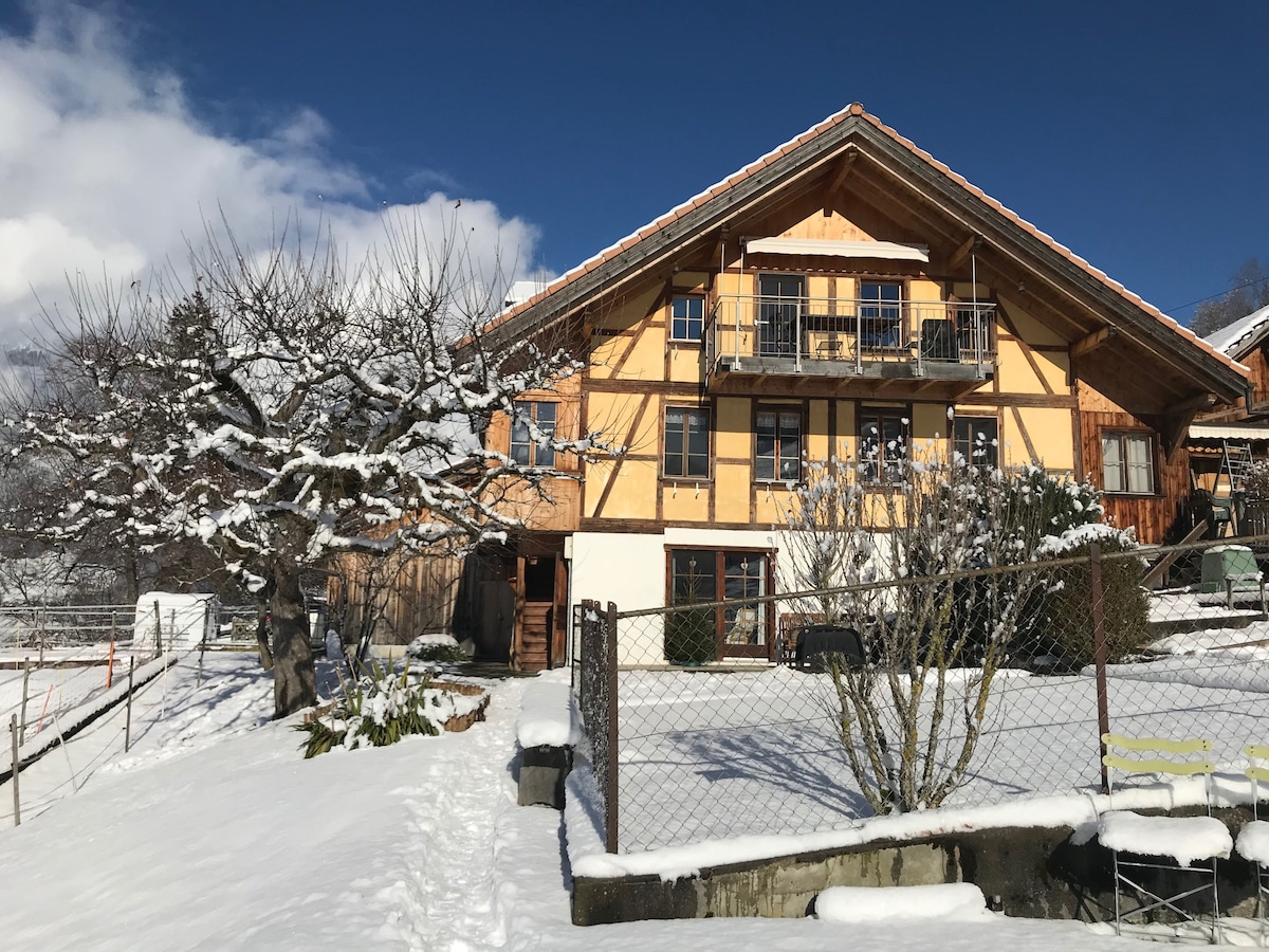 Upplifðu Sviss á viktorískum aldri! Íbúðin þín var upphaflega byggð veturinn 1864/65 fyrir úrsmiðinn Zurbrügg í Aeschi við Thun-vatn. Við höfum innréttað háaloftið í klassísku trébyggingunni fyrir gesti okkar: stór stofa með eldhúsi, baðherbergi og annaðhvort 1, 2 eða 3 svefnherbergi með hjónarúmi. Sum húsgögn koma frá byggingartímabilinu, önnur trésmíði eru sögulega fundin upp og nýlega byggð...eins og bláu útidyrnar.