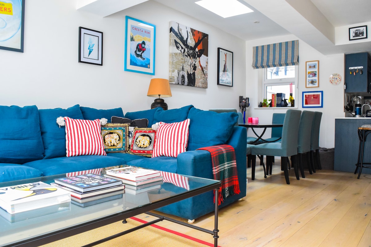Byrjaðu daginn á tebolla á sólarþvegnum þakveröndinni áður en þú ferð aftur í glitrandi hvítt eldhús til að útbúa morgunverð. Þægilegur sófi býður upp á yndislegan stað til að lesa bók í þessari skörpu íbúð í heillandi georgískri byggingu. Þessi nýuppgerða íbúð á efstu hæð er staðsett miðsvæðis í nokkurra mínútna fjarlægð frá Fulham Broadway túpunni sem veitir þér fjölbreyttan aðgang að allri miðborg London. Björt og rúmgóð móttökuherbergi með glænýju eldhúsi með samskeytahellu, ofni, ísskáp, örbylgjuofni og Nespresso-kaffivél. Opið eldhús/ stofa er með sérhannaða setusvæði. Móttakan er með USB-tengi til að hlaða símann þinn (vinsamlegast komdu með símasnúru) og nýuppsett sjónvarp með Netflix. Móttökuherbergin opnast út á verönd sem snýr í suður og vestur með útsýni yfir þroskuð tré sem liggja að garðinum. Fullkominn staður til að njóta morgunkaffis eða drykks snemma kvölds, sem gerir þér kleift að drekka í sig iðandi andrúmsloftið. Innifalið þráðlaust net er í boði. Svefnherbergissvítan er með sérhannaða fataskápa með herðatrjám og glænýju ensuite sturtuklefa með regnsturtu og lýsingu. Við seljum eitt sett af fersku líni fyrir dvöl þína, Nespresso kaffi, te, mjólk, sætindi og sérsniðna handbók til að leiðbeina þér á staðbundnum veitingastöðum og nauðsynjum. Hvort sem dvöl þín í London er fyrir fyrirtæki, túra, versla eða einfaldlega ánægja, þetta er tilvalin miðlæg staðsetning í London. Aftan við bygginguna er aðgangur að kaffihúsum/ veitingastöðum og yndislegum garði, þar sem Boris Bikes eru til leigu ef þú vilt fara í skoðunarferð. 07703004354 - ég er nánast 24/7! Það er strætóstoppistöð rétt fyrir utan íbúðina með leiðum sem bjóða upp á stuttar ferðir til vinsælla staða í London. Harwood Road Apartments eru fullkomlega staðsettar mjög nálægt Fulham Broadway og veita þér aðgang að allri miðborg London í gegnum neðanjarðarnetið og margvíslega rútuþjónustu. Á svæðinu er líflegt andrúmsloft og mikið safn veitingastaða og verslana sem bjóða upp á fjölbreytt úrval af matargerð frá frönsku (Cote Brasserie) til Thai (£ 9,95 fyrir tveggja rétta hádegisverð á móti íbúðum) til Byron Burger til Oyster Bar. Það er líkamsræktarstöð, kvikmyndahús og fallegur garður (með tennisvöllum) allt innan steinsnar!