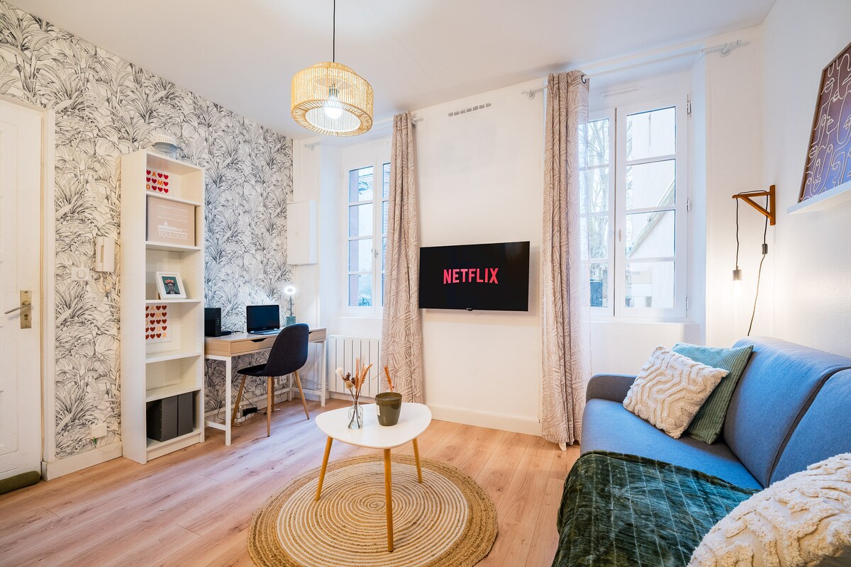 Loftkælda íbúðin okkar er frábærlega staðsett í hjarta Toulouse og er tilvalin staðsetning fyrir alla afþreyingu og tryggir um leið friðsælt andrúmsloft. Gistingin er í innri húsagarði íbúðarbyggingar sem býður upp á ótrúlega ró þrátt fyrir mjög miðlæga staðsetningu. Þegar þú hefur komið þér fyrir getur þú notið heillandi bleiku borgarinnar okkar fótgangandi án þess að hafa áhyggjur af samgöngum.