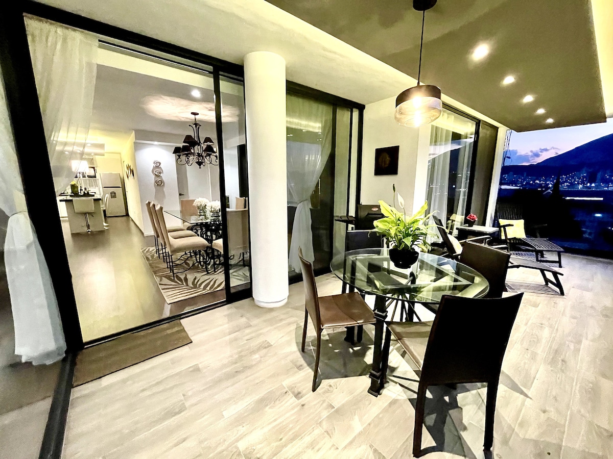 Verið velkomin til Solara! Við hlökkum til að taka á móti þér á einum af íburðarmestu Airbnb eignum okkar í Monterrey. Íbúð með mikilli hæð og gluggum sem umlykja allt rýmið. ¡Einstakt útsýni! Fullbúin og vönduð húsgögn. Þráðlaust net, snjallsjónvarp, loftkæling og 1 einkabílastæði. Tilvalið fyrir stjórnendur, fjölskyldur og ferðamenn. Öryggi allan sólarhringinn, 1 bílastæði og 2 lyftur. Verslunartorg með veitingastað og OXXO í göngufæri. Frábær staðsetning.