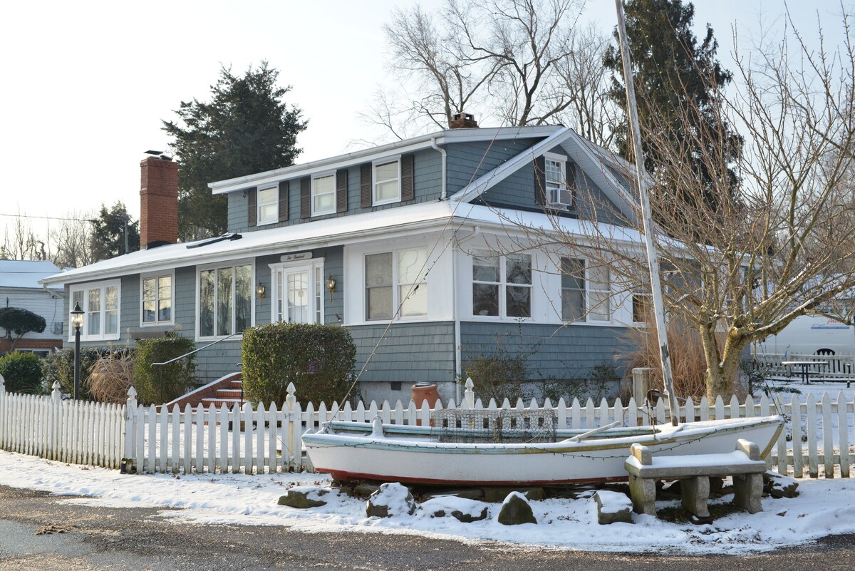 Þetta 2 BR uppgerða heimili við vatnið er með stórt, nútímalegt eldhús, þægilega stofu og vinnuherbergi, nýtt loftræstikerfi, viðararinn og heitan pott. Háhraða FIOS og þráðlaust net. Stór bryggja og pallur í L-lögun sem er tilvalinn fyrir krabbaveiðar og fiskveiðar á tímabilinu. Stórkostlegt útsýni yfir vatnið og sólsetrið. Njóttu fuglaskoðunar, kajakferða eða baðs í heita pottinum.