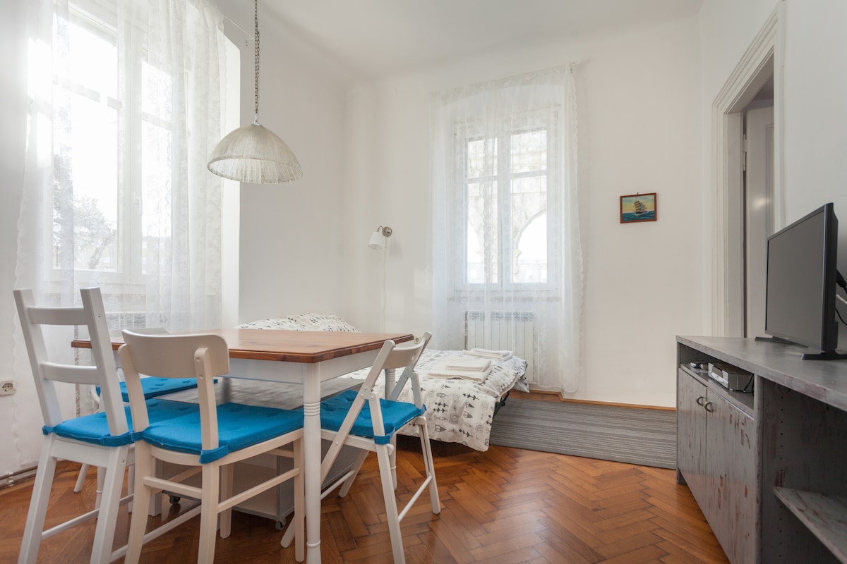 Staðsetning íbúðarinnar er mikil gersemi gamla bæjarins í Pula. Við erum í miðbænum milli allra veitingastaða, bara og verslana. Róleg gata staðsett rétt við hliðina á þekkta hringleikahúsinu. Eins svefnherbergis íbúð með öllu því sem þú þarft - einkabaðherbergi, mini eldhús, loftræsting, þráðlaust net, sjónvarp . Algjörlega ný en staðsett í fornri 19. aldar byggingu í centar gamla bænum í Pula . Lítil útiverönd er það sem þú munt njóta á hlýjum sumarkvöldum.
