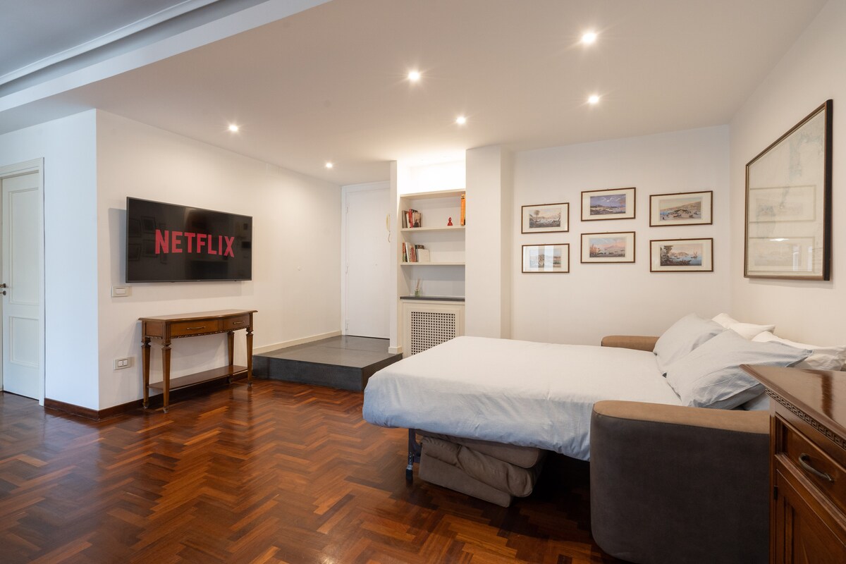 Bjarta íbúðin mín er á sjöttu hæð í byggingu með lyftu. Það er stór stofa með arni, tvöfaldur svefnsófi og svalir með útsýni yfir Via Chiaia; svefnherbergi með hjónarúmi og glugga, baðherbergi með sturtu og glugga og lítið eldhús með þakglugga með öllum tækjum og fullbúið. Frá stofunni er hringstigi sem veitir þér aðgang að stórri verönd. CUSR:15063049LOB5785. CIN:IT063049C2PNPLA5SW.