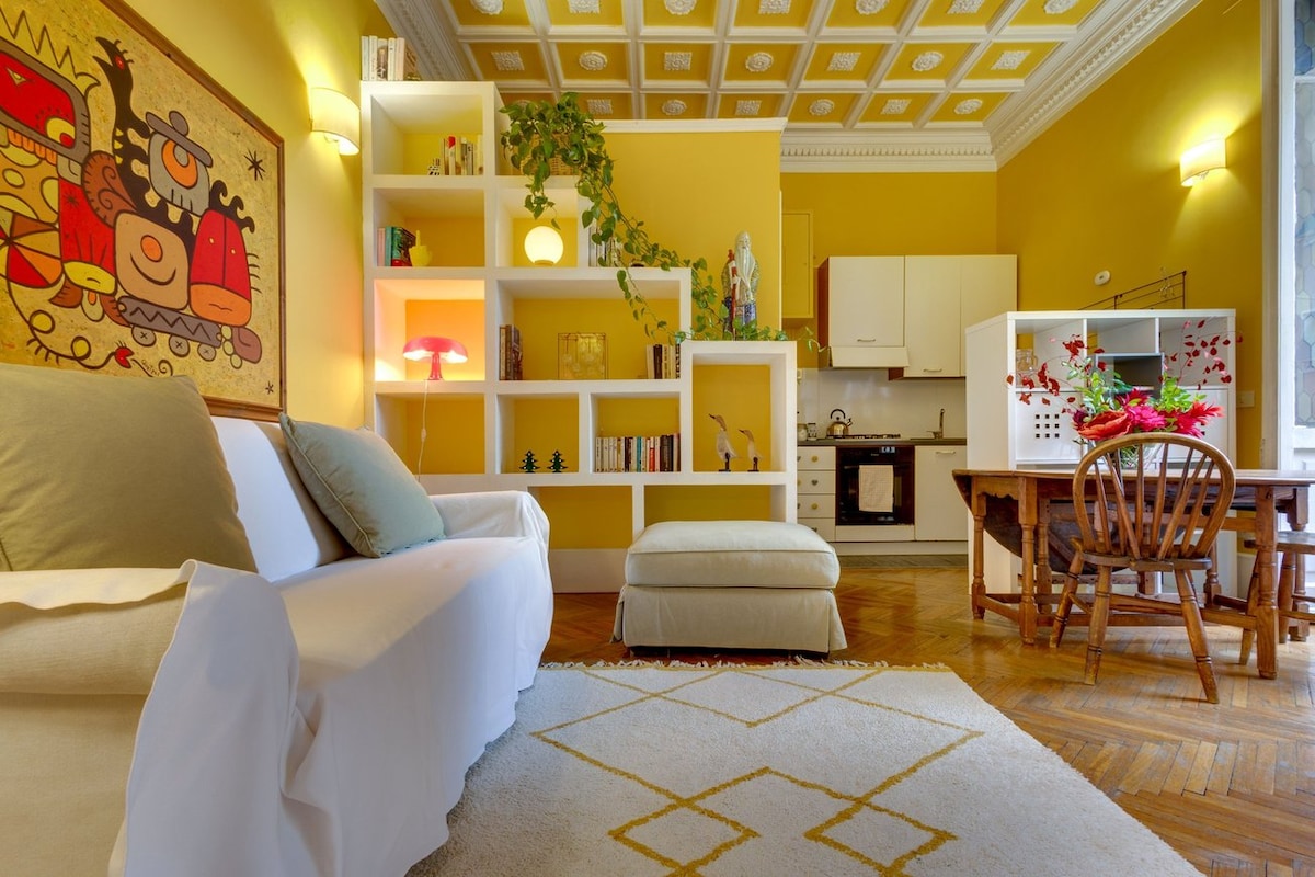 Uncover a sparkling gem where every piece of furniture showcases artisan work through Afghani tapestries, Aleppo's carpets, and batiks from Java. The vibrant home also boasts an array of furnishings, an open-plan layout, and contrasting motifs. The loft is the house of a writer and a traveler. I was for a long time a war correspondent and, in my journeys, I always made a point of bringing back a book, a carpet, a stone, a painting, a fragment of memory so that the world may live in my Roman home. The flat is available for brief stays but also for longer periods. Being less than a block away from the Opera Theatre, it could be the perfect base for singers and musicians. Giuseppe stayed here and this is what he had to say: "The flat is in a quiet street, off Monti. When you enter, it's all very charming. It's not a regular "B&B" experience, it's the flat of a woman who travels a lot for work. The result is very stylish and warm and full of wonderful details. We stayed here for ten days and we really felt at home." The entire 70 square meters loft is at your disposal. The loft has two areas, the living area and the sleeping area. The property is located within walking distance of both the main train station, Termini, and the splendor of the Colosseum. It's a great base for a musician, a writer, or an artist keen to explore the ancient beauty of the Eternal City. L'appartamento è grande 65 metri quadri e si trova a cinque minuti a piedi dalla stazione Termini e a dieci minuti dallo splendore del Colosseo. Luminoso e silenzioso, è la base ideale per un musicista, uno scrittore, o un artista. Were you not inclined to walk, the loft is located between the two main metro lines - A and B - that take you to most of the sightseeing. There is plenty of silence and light. The light is important, I believe and the silence as well. The loft is on the 6th floor, with the elevator. The property is located within walking distance of both the main train station, Termini, and the splendor of the Colosseum. It's a great base for a musician, a writer, or an artist keen to explore the ancient beauty of the Eternal City.