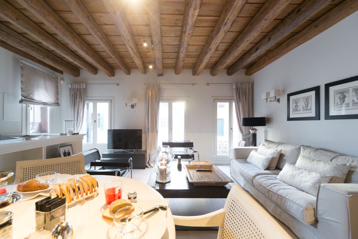 Hafðu það notalegt með bók, fáðu þér morgunverð og kvöldverð á meðan þú dáist að ótrúlegu útsýni yfir bjölluturnana og síki Feneyja, búðu eins og sannur Feneyjarbúi í dæmigerðasta hverfi Feneyja, nokkrum skrefum frá Rialto-brúnni, Ca' D' oro og San Marco í íbúð með húsgögnum og skreytingum frá Feneyjum og Murano handverksmönnum. Þú munt líða eins og þú sért að upplifa frábært andrúmsloft 1800s en með öllum þægindum nútímalegrar íbúðar. Ekki missa af þessari ótrúlegu upplifun