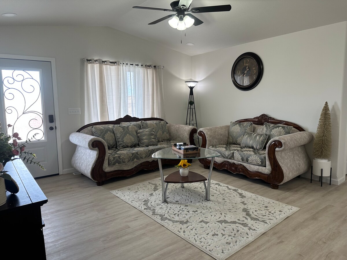 Bókaðu þér gistingu með þessu nýbyggða heimili sem er innréttað með hugmyndinni um þægilegt heimili að heiman. Á þessu heimili eru 3 svefnherbergi og 2 baðherbergi og fullbúið eldhús ásamt stofu. Þú finnur eldhúsið með nauðsynjum fyrir eldun og fleiru. (ofni, ísskáp, örbylgjuofni, pottum, pönnum, eldunaráhöldum, diskum, brauðrist, kaffivél, uppþvottavél) Reykingar bannaðar, engin gæludýr. Uppsetning á svefnherbergi Hjónaherbergi - King-rúm með fullbúnu einkabaðherbergi Gestasvefnherbergi - rúm af queen-stærð Kojuherbergi - 2 einstaklingsrúm