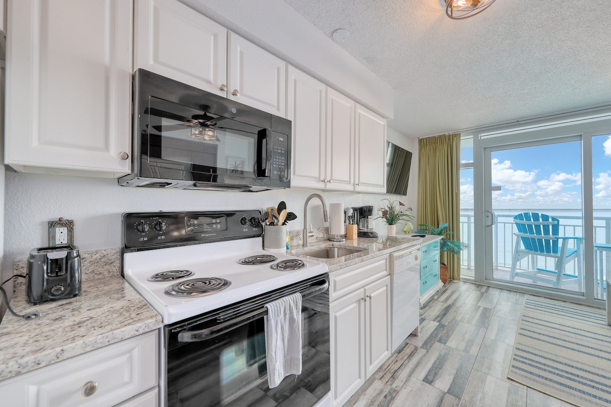 Grein á HGTV 's "Beach Front Bargain Hunt"!- Falleg, nýlega endurbætt íbúð við sjávarsíðuna, alveg við ströndina! Bæði stofan og svefnherbergið eru með sjávarútsýni. Það er King Size rúm í aðalsvefnherberginu og King-rúm í 2. svefnherbergi. 3 sjónvörp, eitt í hverju herbergi. og eitt stórt sjónvarp í stofunni. Það er Murphy-rúm og svefnsófi. Nálægt nýju bryggjunni, verslunum, veitingastöðum og golfi. Það er ein öryggismyndavél á gangveginum sem leiðir að útidyrunum. Það er alltaf kveikt á þessu.
