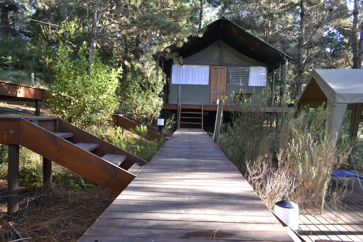 Camping in style without the drama. Exclusive tent on decks in the pines overlooking a small dam. 5 min from Victoria Bay and Garden Route Mall. Ideal for peaceful retreat or honeymoon getaway. Separate cabin with kitchen and outdoor dining. All linked on wooden walkways so your feet don't have to touch the forest floor. Extra tent with 2 single beds for older children. Fire pit for relaxing evenings. There is only the one glamping site, so no other campers nearby.