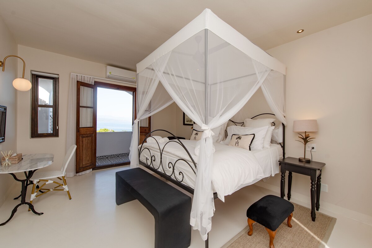 Welcome to The Ivory Haus in Plettenberg Bay, offering an unparalleled vantage point of the ocean & centrally located on Main Street. Casa Azure offers a spacious sanctuary with a beautiful private balcony showcasing captivating sea views. Discover an in-room bar with bespoke drink options, and relish complimentary tea, coffee, and bottled water. Immerse yourself in a Victorian bath and unwind with TV and Netflix. Enjoy a restful sleep beneath a luxury bed adorned with a mosquito net.