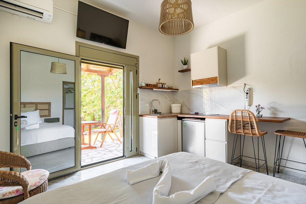 Gott og rúmgott stúdíó sem er 40 fermetrar að stærð. Notalegt og bjart rými með: •Tvíbreitt rúm 180x200 og svefnsófi með tveimur svefndýnum (90x200) •Fullbúið eldhús og þvottavél. •Baðherbergi með baðkeri, loftræstingu, þráðlausu neti, sjónvarpi og myrkvunargluggatjöldum fyrir fulla afslöppun. Nálægt Costa Navarino, Gialova og ströndum Voidokilia, Chrissi Akti, Lagouvardos. 5-10 km frá fornleifasvæðum. Frábært til að slaka á og skoða sig um!