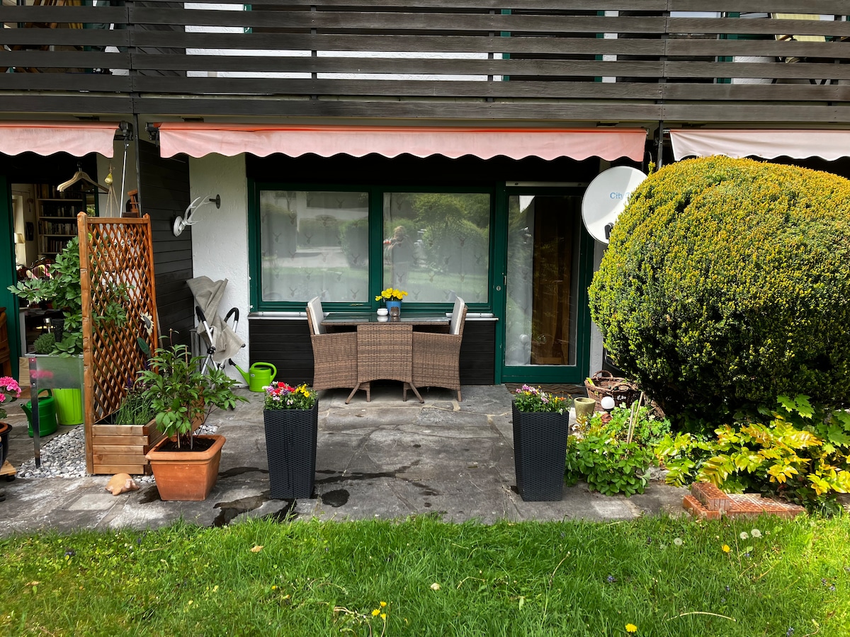 Cosy one-bedroom apartment on the first floor (one up from the ground floor) in a house located in a quiet street between the center of Garmisch and the Hausberg area. The flat has a north and a south balcony. Guests may make use of one underground parking space. Personal informations (name, adress, date of birth, etc.) have to be given for GaPa-Tourist office by us. Pets are very welcome, but dogs are not allowed to stay alone in the flat if they are barking.