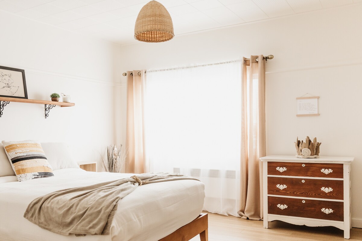 Staðsett í Auberge Bleu sur Mer í Port-Daniel, fallegu herbergi með zen-innréttingu þar sem eru 2 stórir gluggar. Rúmgóð sturta með fallegum sjávarsteinum undir fótum þínum! Þetta herbergi, með hægindastólarúmi, rúmar barn 12 ára og yngra. Morgunverður, ekki innifalinn, í boði á háannatíma. Ef þetta herbergi er ekki lengur laust skaltu hafa samband við okkur, við erum með aðrar gistieiningar. Við hlökkum til að taka á móti þér! (CITQ-leyfi 090145)