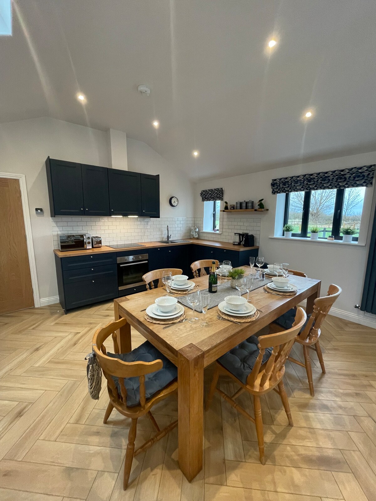 Við erum stolt af því að skrá aðra eignina okkar, „hreiðrið“. Múrsteinsbyggður aðskilinn bústaður með sveitalegri nútímalegri hönnun bóndabæjarins, þægilegri heimilisupplifun, tilvalinn fyrir rómantískar ferðir. Lúxusgisting okkar er með notalega opna setustofu/borðstofu með múrsteinsveggjum með frönskum hurðum sem leiða að einka veglegri verönd með lúxus 6 sæta heitum potti til einkanota, fullbúið eldhús, lúxus baðherbergi, glæsilegt, panelled svefnherbergi með king-size rúmi.