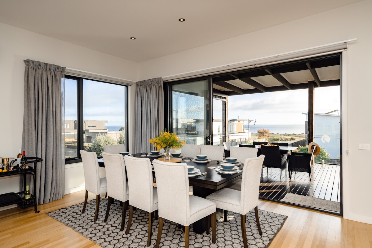 Glænýtt og glæsilegt afdrep í hjarta Torquay! Þetta heimili er með þrjár aðskildar vistarverur og er upplagt fyrir nokkrar fjölskyldur. Heimilið er fullt af dagsbirtu og státar af samþættu inni-/útirými. Þú getur notið tveggja góðra skemmtisvæða utandyra. Þessi rúmgóði, grasi vaxni bakgarður er fullkominn staður til að slappa af eftir dag á ströndinni eða við að skoða ströndina. Allt hefur verið úthugsað, allt frá Foxtel, borðtennis, leikföngum og borðspilum.