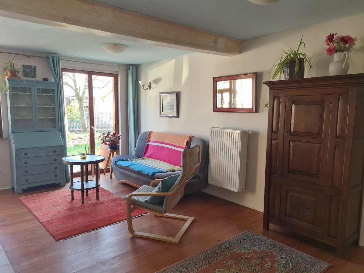Die liebevoll eingerichtete, helle Einliegerwohnung am Ortsrand gelegen, ist keine 50m vom Naheufer und dem Barfußpfad entfernt. Sie ist ca. 64 qm groß, verfügt über einen eigenen Eingang mit eigenem Parkplatz. Ausgestattet ist sie mit einer neuen Küche, einem Schlafzimmer mit gemütlichem 1,80 Doppelbett , einem Wohn- und Esszimmer mit Fernseher, sowie einem komfortablen Bad mit bodentiefer Dusche und WC & einer kleinen Terrasse. Handtücher, Bettwäsche und Föhn stehen kostenfrei zur Verfügung.