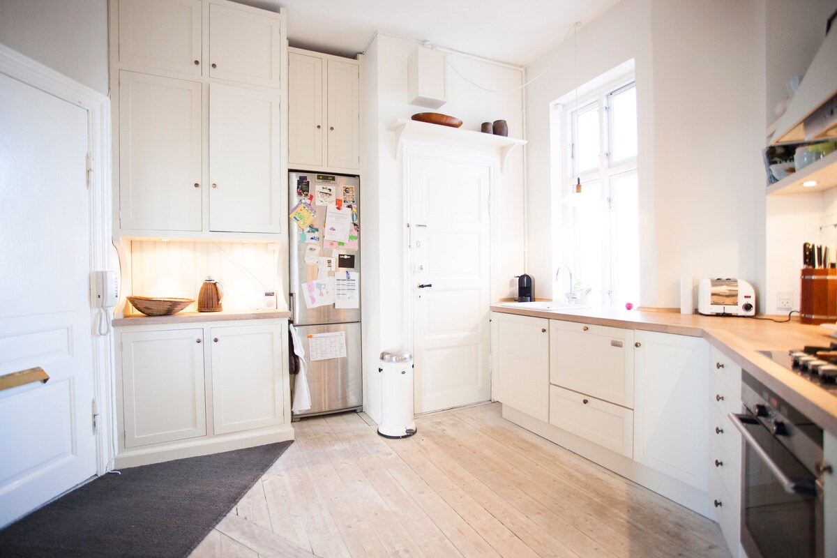 Íbúðin er í gömlu húsi með háu þaki, miklu og miklu ljósi og svölum sem snúa beint til suðurs svo að þú getur notið sólarupprásarinnar og sólsetursins með útsýni yfir hafið og litlu höfnina. Eldhús og borðstofa eru tvö herbergi tengd með tvöfaldri hurð. Svefnherbergið er bjart og hreint með mjög þægilegu king size rúmi. Stofurnar tvær eru alltaf góðar og hreinar með viðareldavél. Eldhúsið er euqipped að fullu með ísskáp, frystir, diskur þvottavél, brauðrist, blöndunartæki, juicer, sápur osfrv. Íbúðin er á þriðju hæð og mjög róleg og björt. Ég held honum alltaf hreinum og fínum. Íbúðin hentar ágætlega fyrir par, vini eða viðskiptaferðamenn sem vilja vakna upp við eitthvað einstakt og bjart. Svæðið Þetta er eitt vinsælasta og mest aðlaðandi svæðið í borginni núna með mörgum verslunum og að sjálfsögðu þekktum kaffihúsum og bakaríum Emmerys og Lagkagehusets á horninu, flottum hönnunarverslunum og góðum veitingastöðum. Fjarlægðir frá Aiport: 30 mín. með bíl. 30 mín. með Strætó og Metro. Þú þarft að taka lestina á Hellerup stöðina og svo 10 mín göngutúr eða taka leigubíl frá stöðinni. Hafið og fínn lítill strönd er við hliðina á húsinu og höfn með tennisvelli og rósagarði. Stórverslun: 100m Cafe: 100 m. Miðborg: 8 km. Verkfæri / sælgæti Stórt king size rúm Ókeypis mjög hratt þráðlaust net Lak og hulstur fyrir rúmið 40" flatskjássjónvarp með eplasjónvarpi, tengdum alþjóðlegum fréttarásum og Netflix aðgangi í boði. Ókeypis bílastæði við götuna. Góð hljóðkerfi sem styðjast við Apple Airport svo þú getir spilað þráðlaust í gegnum Itunes, Ipod, Iphone eða bara með því að tengja við jack plugginn. Eldhús er euqipped að fullu með ísskáp, frystir, diskur, þvottavél, brauðrist, blöndunartæki, juicer, sápur osfrv. Góð, mjúk og hlý rúmföt og koddar. Þvottavél í kjallara. Handklæði og salernispappír. Góður gestgjafi. Láttu mig vita ef þú þarft eitthvað og ég mun gera mitt besta til að leiðbeina þér eða aðstoða þig.