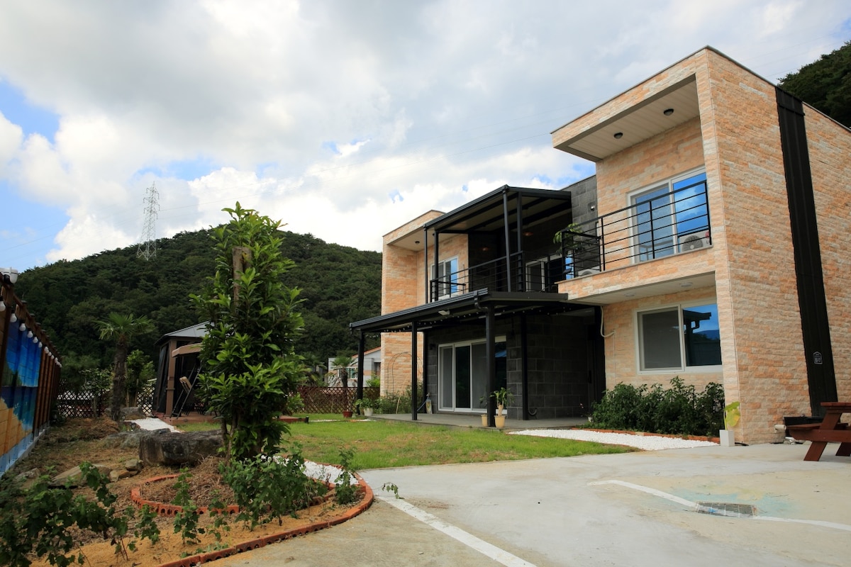 * Geoje Blue Sky * Ocean View and Mountain View Cottage 1st and 2nd floor of the whole large garden, fire pit, cauldron, barbecue, etc.