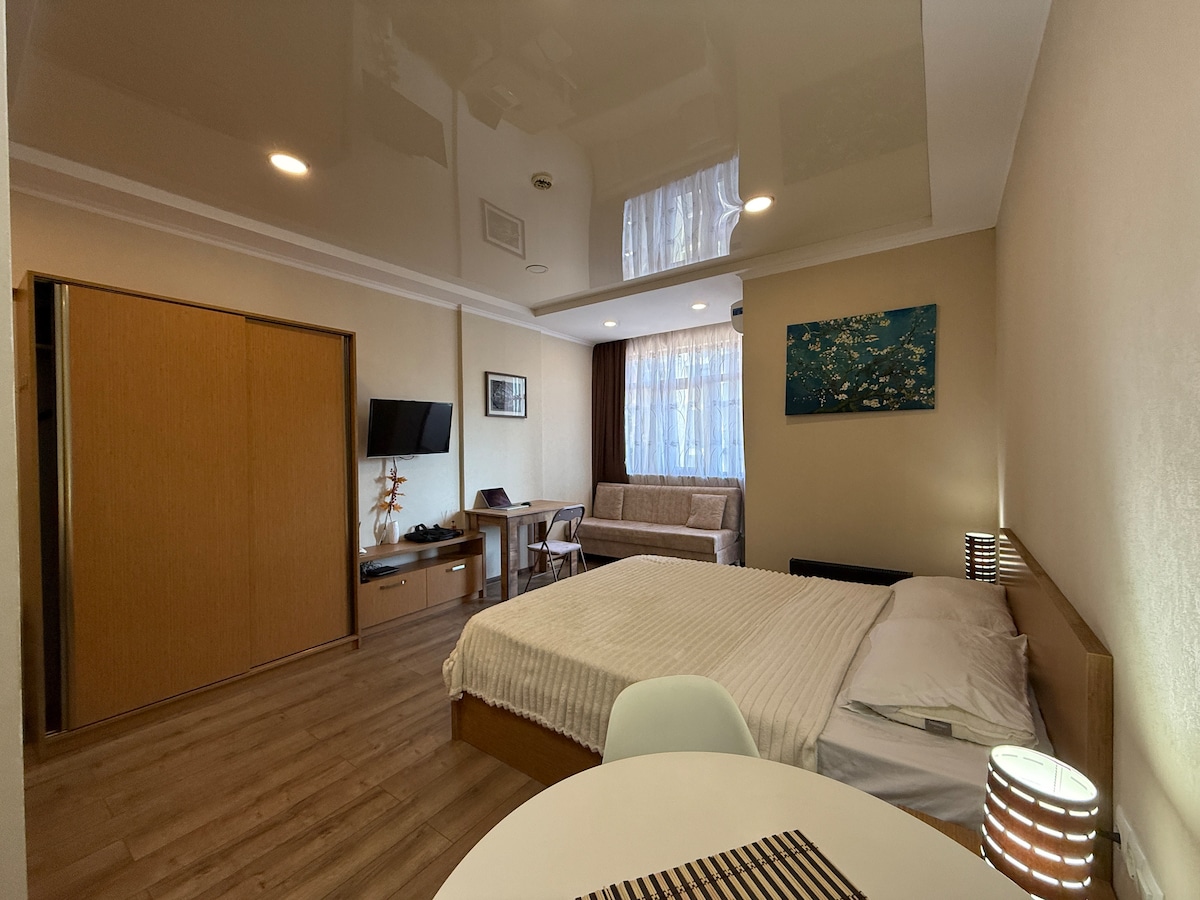 In the heart of old Batumi, in an old green courtyard, with two large verandas, we offer a small studio-type apartment, with a separate bedroom and bathroom. 100 meters from the boulevard and the beach. three-story house is in the old historical part, but the rooms are new, clean and newly renovated. You can enjoy a cup of coffee on your own veranda or in Europe Square. there are cafes, restaurants, bars etc. To get to the apartment, you need to go up the stairs.