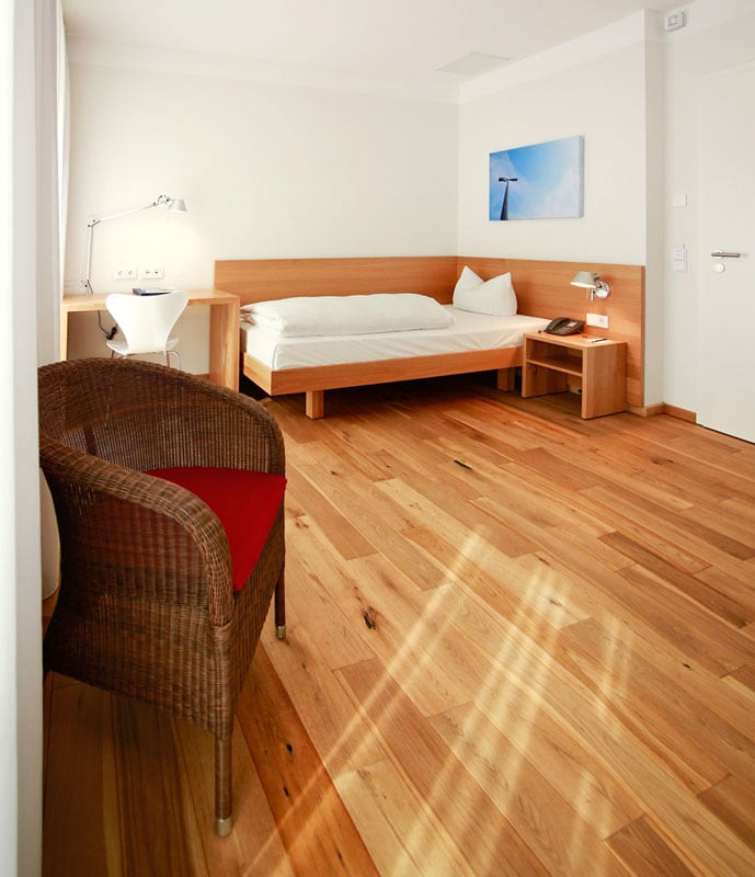 Clear, natural and yet highly comfortable: our 20 square meter rooms have a single bed (100 x 220 cm), bathroom with shower and a fully equipped work area. The rooms are located either on the first floor or on the upper floor, you are welcome to indicate your preference when booking.