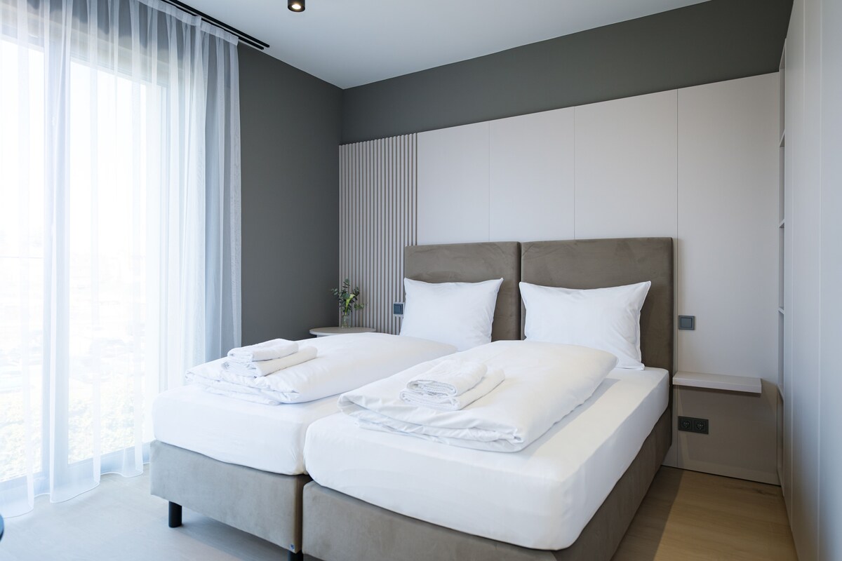 Íbúðirnar okkar fjórar eru 43 m²-52 m² að stærð og eru hrifnar af nútímalegum og stílhreinum húsgögnum sem bjóða upp á glæsilegt afdrep í borginni. Njóttu lúxus næðis, rúmgæðis og afslöppunar. Íbúðirnar eru með rúmgóðu svefnherbergi með king-rúmi (180 × 200) ásamt fullbúnu eldhúsi, opinni stofu og borðstofu og rúmgóðum inngangi.