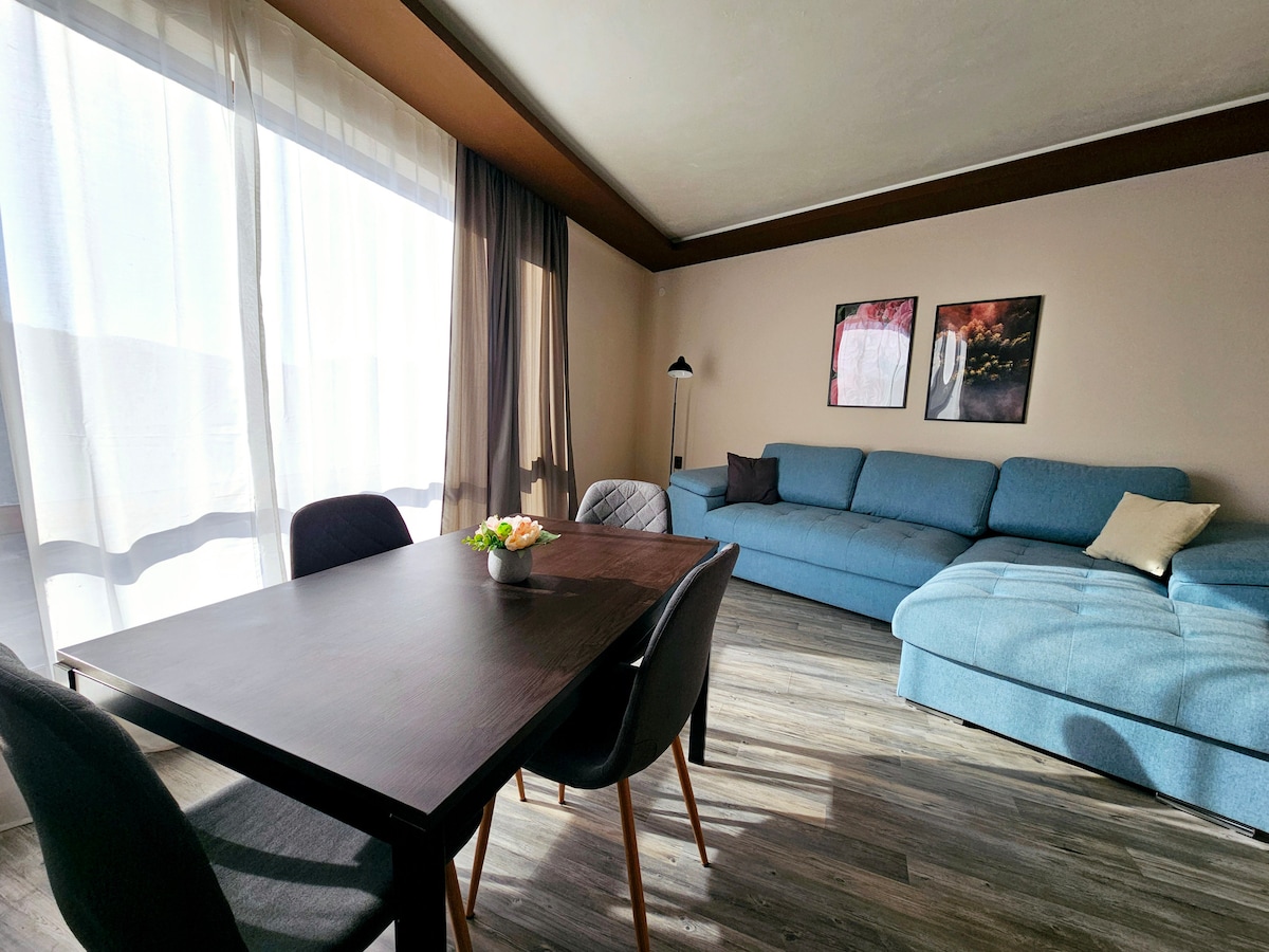Njóttu þægilegrar dvöl í þessari 64 m² íbúð með einu svefnherbergi, fullkomlega staðsett í Veliko Tarnovo. Í stofunni er svefnsófi fyrir tvo sem gerir hana fullkomna fyrir allt að fjóra gesti. Þú munt hafa fullbúið eldhús, einkasvalir og baðherbergi. Nærri stórum matvöruverslunum (Lidl, Billa) og strætisvagnastöðvum. Ókeypis bílastæði við götuna og auðveld innritun með lyklaboxi. Er með Netflix-app. Þú getur notað Netflix-reikninginn þinn. Fullkomið fyrir afslappandi og þægilega heimsókn í sögulega borg Búlgaríu!