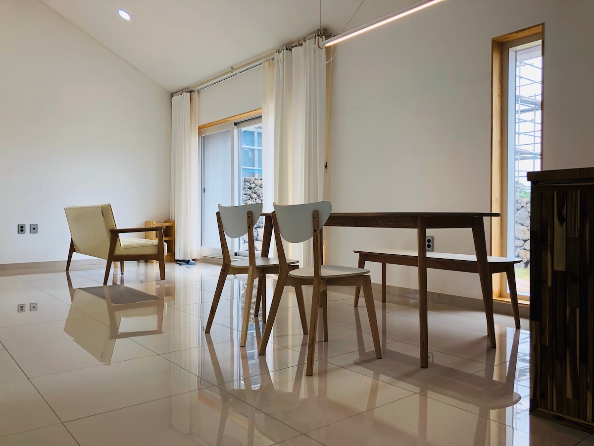 Sand&Milk - Sand er ráðlagt fyrir þetta fólk. Pör, fjölskyldur og litlir hópar sem leita að einkahúsnæði Fólk sem vill slaka á í ró og njóta þess að vera í heima í nuddpottinum og við arineldinn Fólk sem kann að meta tilfinningaþrungna rými og innréttingar Fólk sem sækist eftir þægilegri gistingu með félagsskap og hreyfingu Leiðbeiningar fyrir 🛋 rými Stofa og eldhús / 2 svefnherbergi Sérbaðherbergi fyrir hvert svefnherbergi → Þetta er bygging þar sem þú getur gist þægilega með félögum. Hátt til lofts, há húsgögn og leikmunir frá öðrum heimsálfum Þetta er einkagististaður með hlýju og framandi andrúmslofti. Gestgjafinn smíðaði húsið sjálfur og lagði mikla vinnu í smáatriðin. ♨️ Nuddpottur og 🔥 eldstæði Nuddpottur með útsýni yfir náttúruna Ljúktu deginum rólega með kvöldverði. ☕ Einföld dögurð og kaffitími Þannig að þú getir notið einfaldrar dögurðar Við höfum útbúið hráefni fyrir morgunverð og eldhúsáhöld. 🎬 Úrval af þægindum Uppþvottavél / þvottavél / þurrkari o.s.frv. Þú getur gist þægilega jafnvel þótt þú komir aðeins. Þetta er skráð gistiaðstaða sem er opinberlega skráð sem nr. 1298 í Aewol, Jeju.