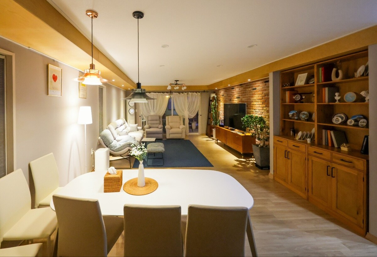 -Þessi eign er á annarri hæð byggingarinnar. Það eru tvö svefnherbergi, stofa og baðherbergi. Það er Hwangbang GS kjörbúð í 1 mínútu fjarlægð. -Þetta er rúmgott og hreint endurnýjað tveggja hæða hús. -Stofan er nógu rúmgóð til að vinir og fjölskylda geti notið hennar og þar er einnig borðstofuborð fyrir þrjá. -Gistingin er stofa með tveimur herbergjum, borðstofuborði og eldhúsi. Í eldhúsinu eru skálar og pottar til matargerðar ásamt örbylgjuofni og hrísgrjónaeldavél. -Stóra herbergið er með tveimur einbreiðum rúmum og litlu herbergi með einu rúmi svo að ég held að það verði þægilegri hvíldarstaður. - Þetta er notaleg eign með stóru sjónvarpi í stofunni, stjörnuhátalara og loftræstingu í hverju rými. - Veggir gistiaðstöðunnar eru skreyttir með málverkum og því er hún skreytt sem gallerí. -The Hanok Village is 10 minutes away, and it is located 5 minutes from the new city center, and there are Seosin-dong Makgeolli Alley and Gamaekjip around the house. - Bílastæði eru fyrir framan og nálægt húsinu.