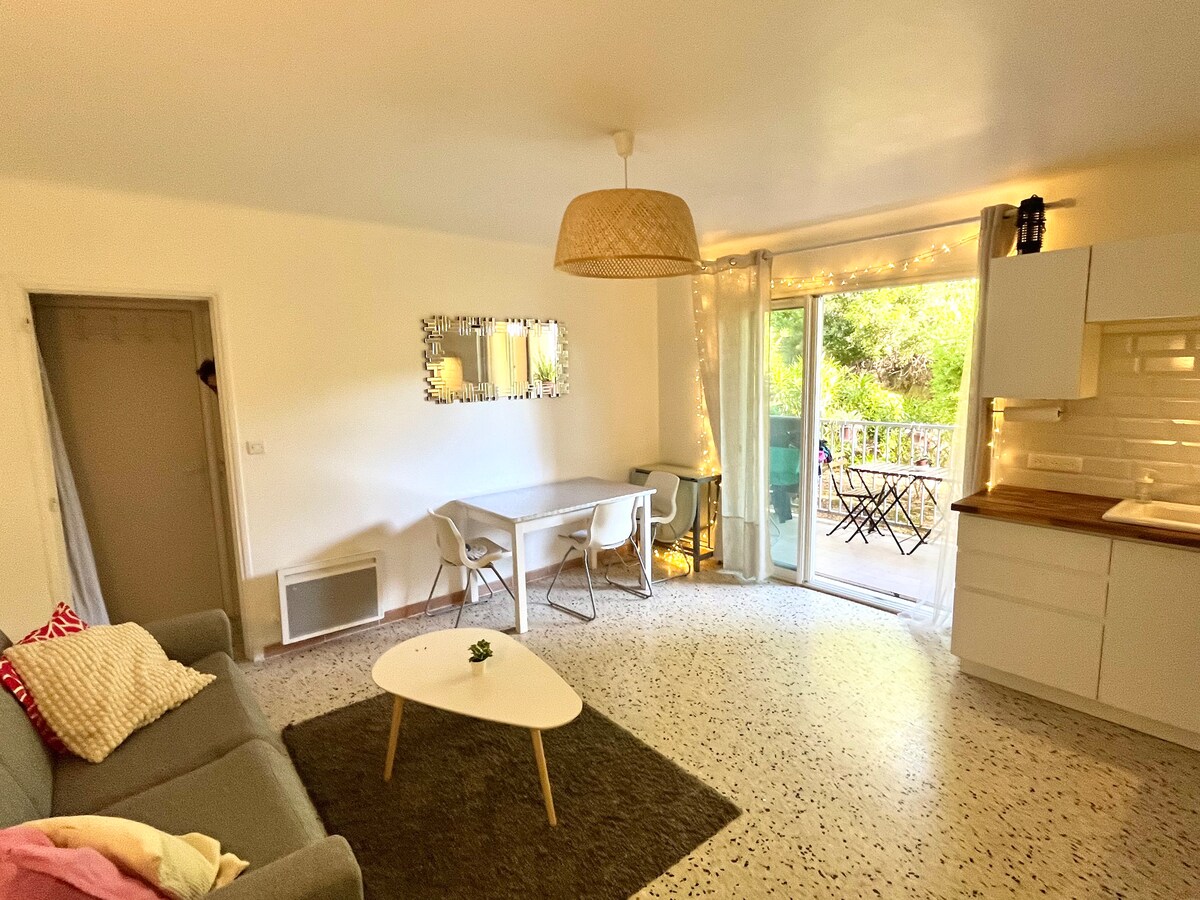Lítil íbúð tilvalin fyrir 2, endurnýjuð, hún er með svefnherbergi, notalega verönd sem snýr að góðu sjávarútsýni, sundlaugin er í húsnæðinu við rætur íbúðarinnar. 800 m frá sjónum og 5 mín göngufjarlægð frá höfninni og þorpinu, bílastæði í húsnæðinu. Hún er fullbúin með hjólaherbergi. Ég myndi gefa þér réttu áætlunina til að fá sem mest út úr litlu paradísinni okkar og eyjunum á móti. Ekki hika við að skoða jákvæðu umsagnirnar sem þú hefur fengið. Sjáumst mjög fljótlega